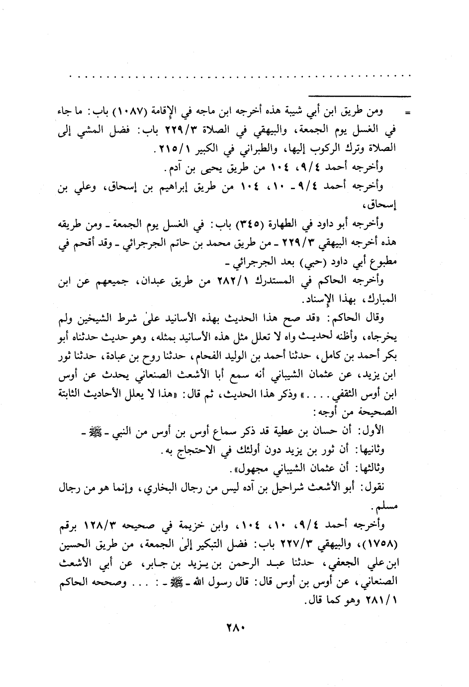 وقال الحاكم: "قد صح هذا الحديث بهذه الأسانيد على شرط الشيخين ولم يخرجاه، وأظنه لحديث واه لا تعلل مثل هذه الأسانيد بمثله، وهو حديث حدثناه أبو بكر أحمد بن كامل، حدثنا أحمد بن الوليد الفحام، حدثنا روح بن عبادة، حدثنا ثور ابن يزيد، عن عثمان الشيباني أنه سمع أبا الأشعث الصنعاني يحدث عن أوس ابن أوس الثقفي .... " وذكر هذا الحديث، ثم قال: "هذا لا يعلل الأحاديث الثابتة الصحيحة من أوجه: