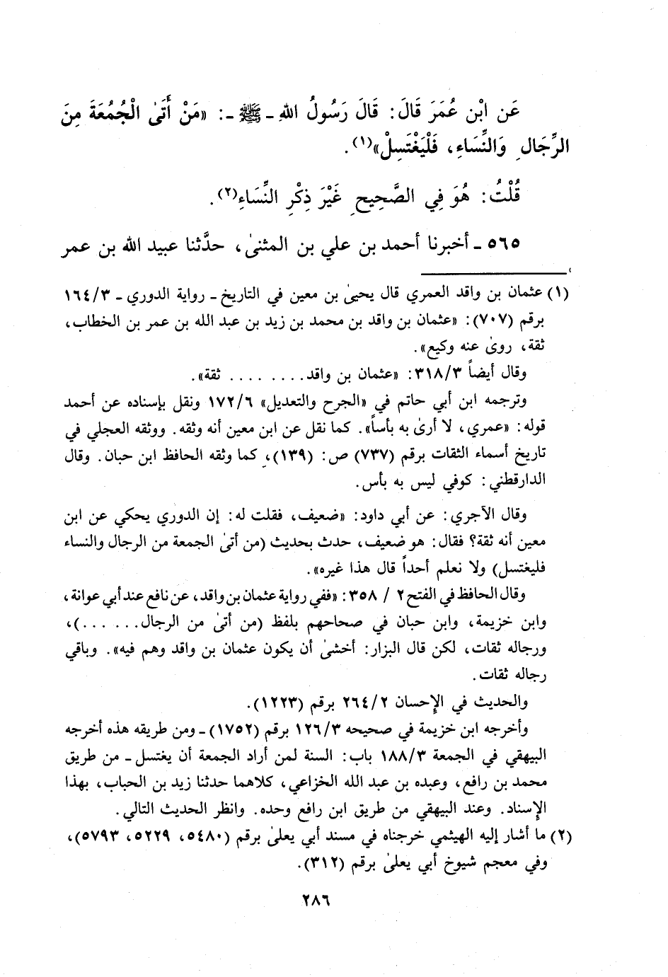 وقال الحافظ في الفتح 2/ 358: "ففي رواية عثمان بن واقد، عن نافع عند أبي عوانة، وابن خزيمة، وابن حبان في صحاحهم بلفظ (من أتى من الرجال ...... )، ورجاله ثقات، لكن قال البزار: أخشى أن يكون عثمان بن واقد وهم فيه". وباقي رجاله ثقات. والحديث في الإِحسان 2/ 264 برقم (1223).