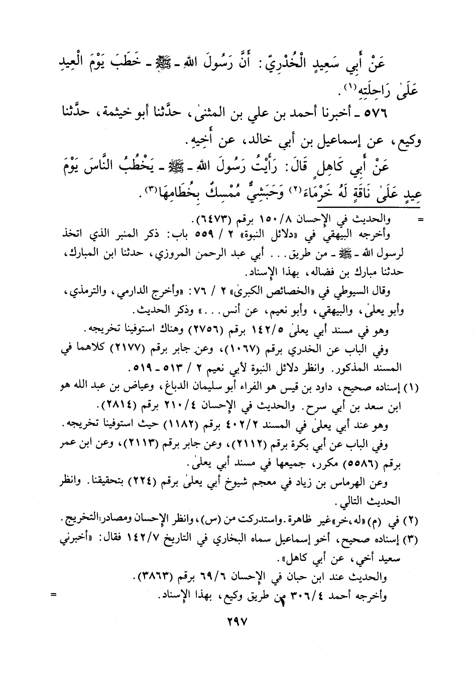 عَنْ أبِي سَعِيدٍ الْخُدْرِيّ: أنَّ رَسُولَ اللهِ - صلى الله عليه وسلم - خَطَبَ يَوْمَ الْعِيدِ عَلَى رَاحِلَتِهِ (¬1).