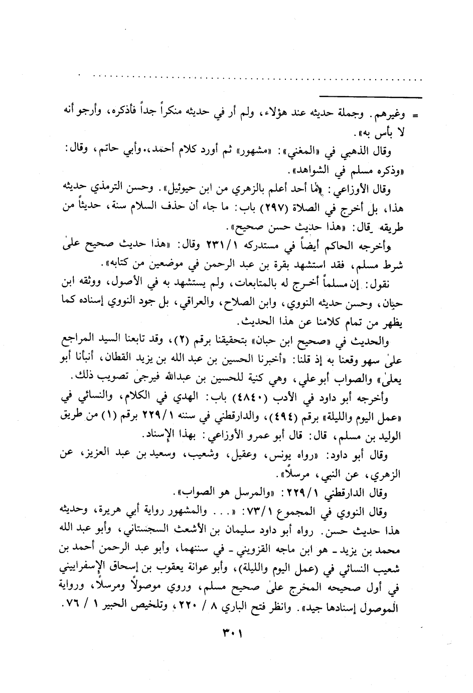 وقال الأوزاعي: ما أحد أعلم بالزهري من ابن حيوئيل". وحسن الترمذي حديثه هذا، بل أخرج في الصلاة (297) باب: ما جاء أن حذف السلام سنة، حديثاً من طريقه قال: "هذا حديث حسن صحيح".
