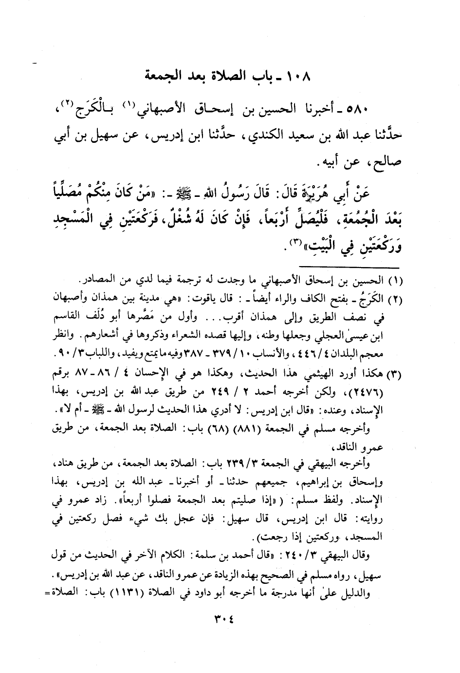580 - أخبرنا الحسين بن إسحاق الأصبهاني (¬1) بالْكَرَج (¬2)، حدَّثنا عبد الله بن سعيد الكندي، حدَّثنا ابن إدريس، عن سهيل بن أبي صالح، عن أبيه.