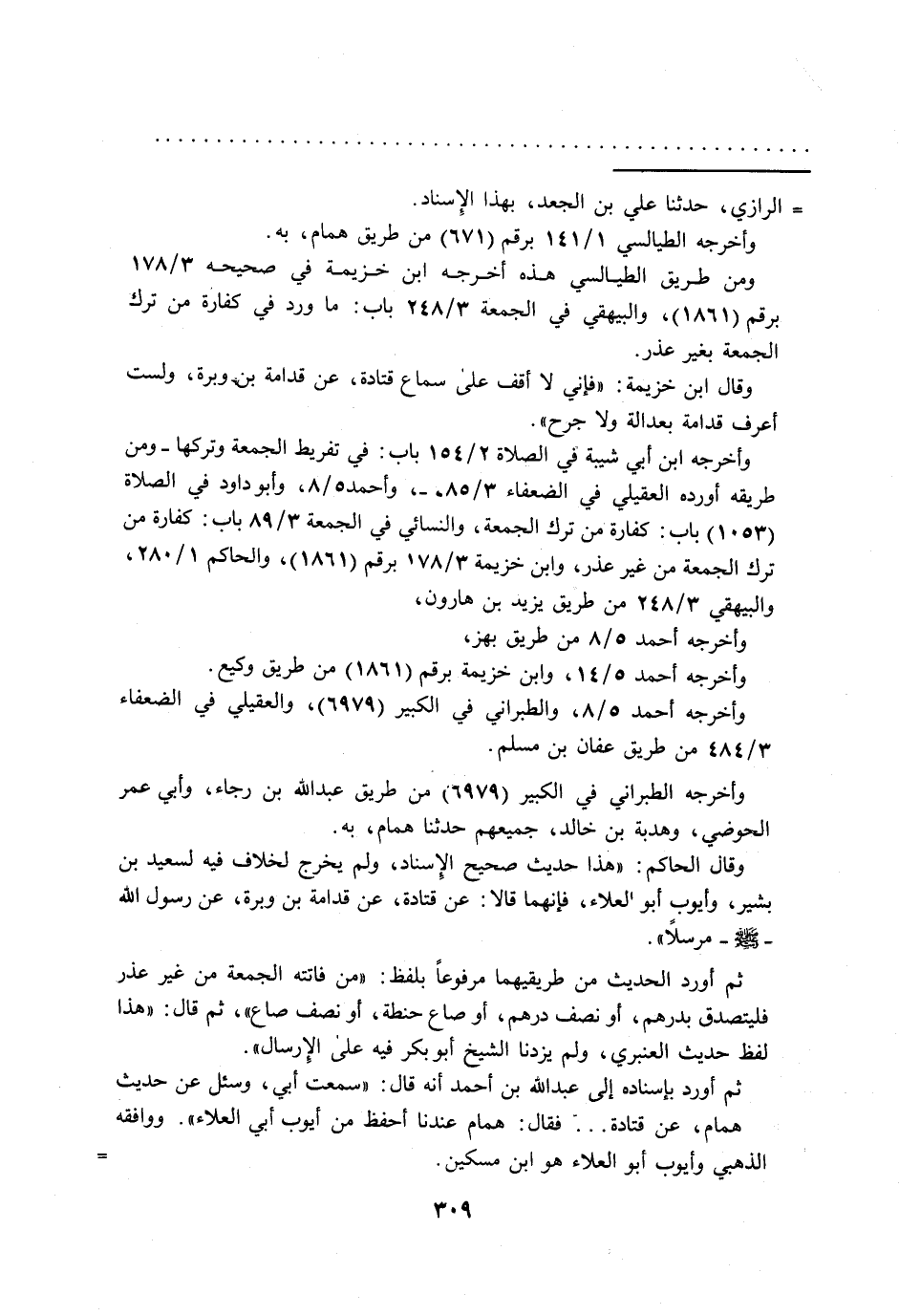 ومن طريق الطيالسي هذه أخرجه ابن خزيمة في صحيحه 3/ 178 برقم (1861)، والبيهقي في الجمعة 3/ 248 باب: ما ورد في كفارة من ترك الجمعة بغير عذر.