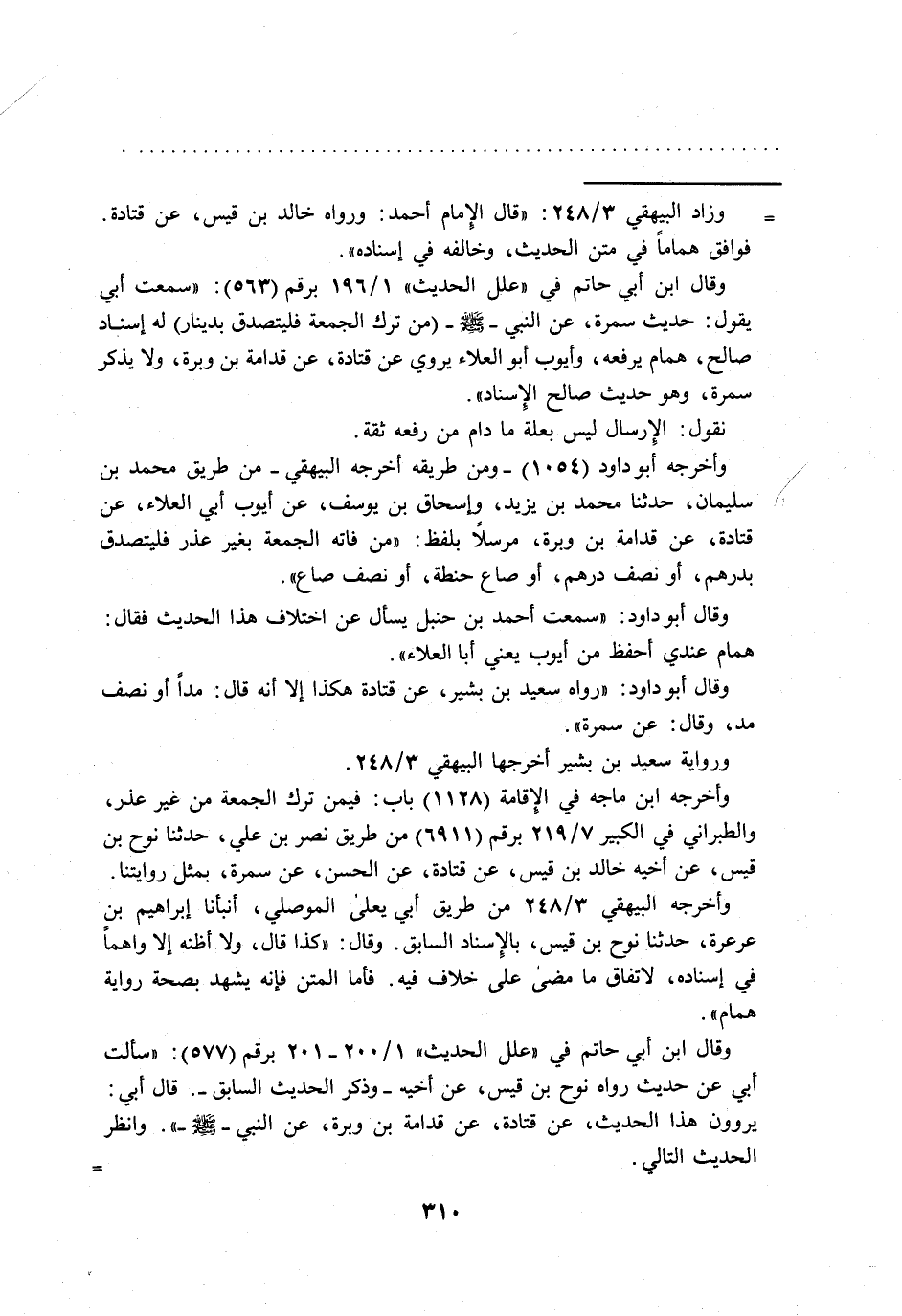 يقول: حديث سمرة، عن النبي - صلى الله عليه وسلم - (من ترك الجمعة فليتصدق بدينار) له إسناد صالح، همام يرفعه، وأيوب أبو العلاء يروي عن قتادة، عن قدامة بن وبرة، ولا يذكر سمرة، وهو حديث صالح الإِسناد". نقول: الإرسال ليس بعلة ما دام من رفعه ثقة.
