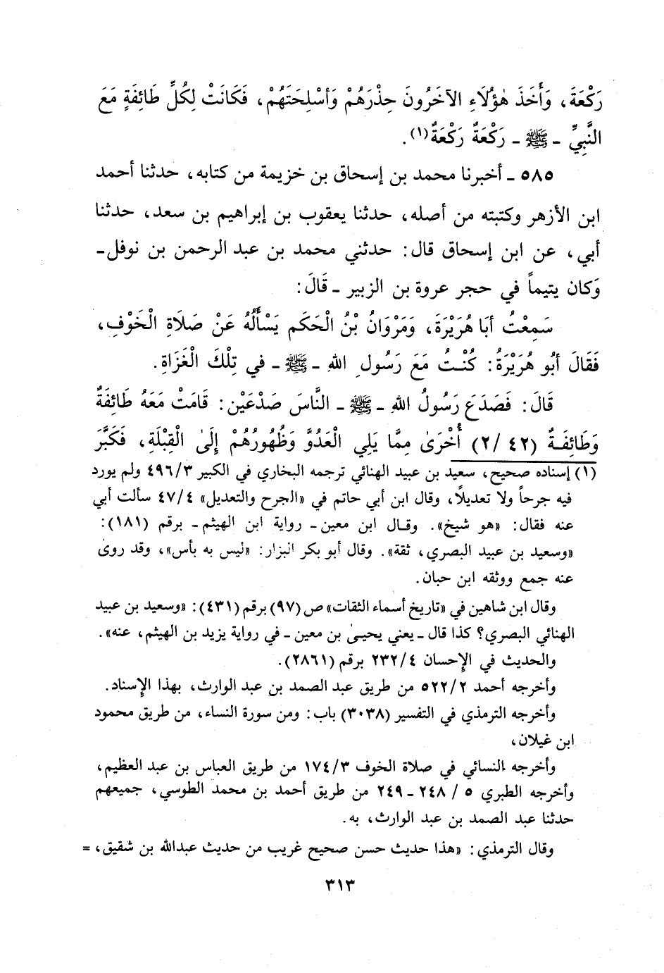 رَكْعَةَ، وَأخَذَ هؤلاَءِ الآخَرُونَ حِذْرَهُمْ وَأسْلِحَتَهُمْ، فَكَانَتْ لِكُلِّ طَائِفَةٍ مَعَ النَّبِيِّ - صلى الله عليه وسلم - رَكْعَةٌ رَكْعَةٌ (¬1).