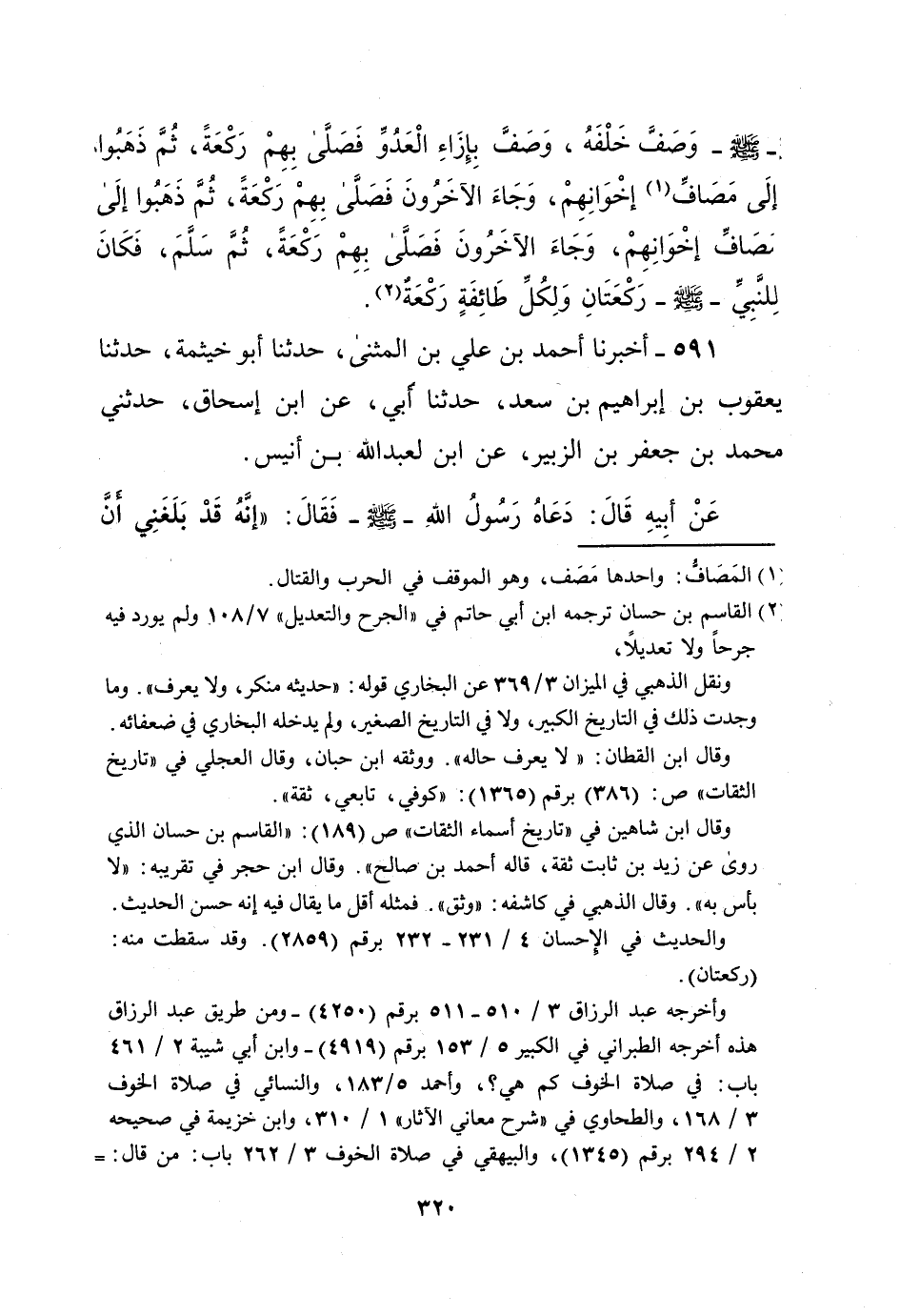 591 - أخبرنا أحمد بن علي بن المثنى، حدثنا أبو خيثمة، حدثنا يعقوب بن إبراهيم بن سعد، حدثنا أبي، عن ابن إسحاق، حدثني محمد بن جعفر بن الزبير، عن ابن لعبد الله بن أنيس.