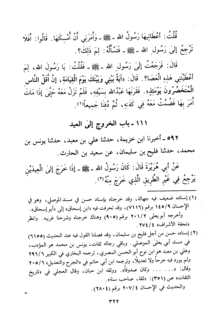 592 - أخبرنا ابن خزيمة، حدثنا. علي بن معبد، حدثنا يونس بن محمد، حدثنا فليح بن سليمان، عن سعيد بن الحارث.