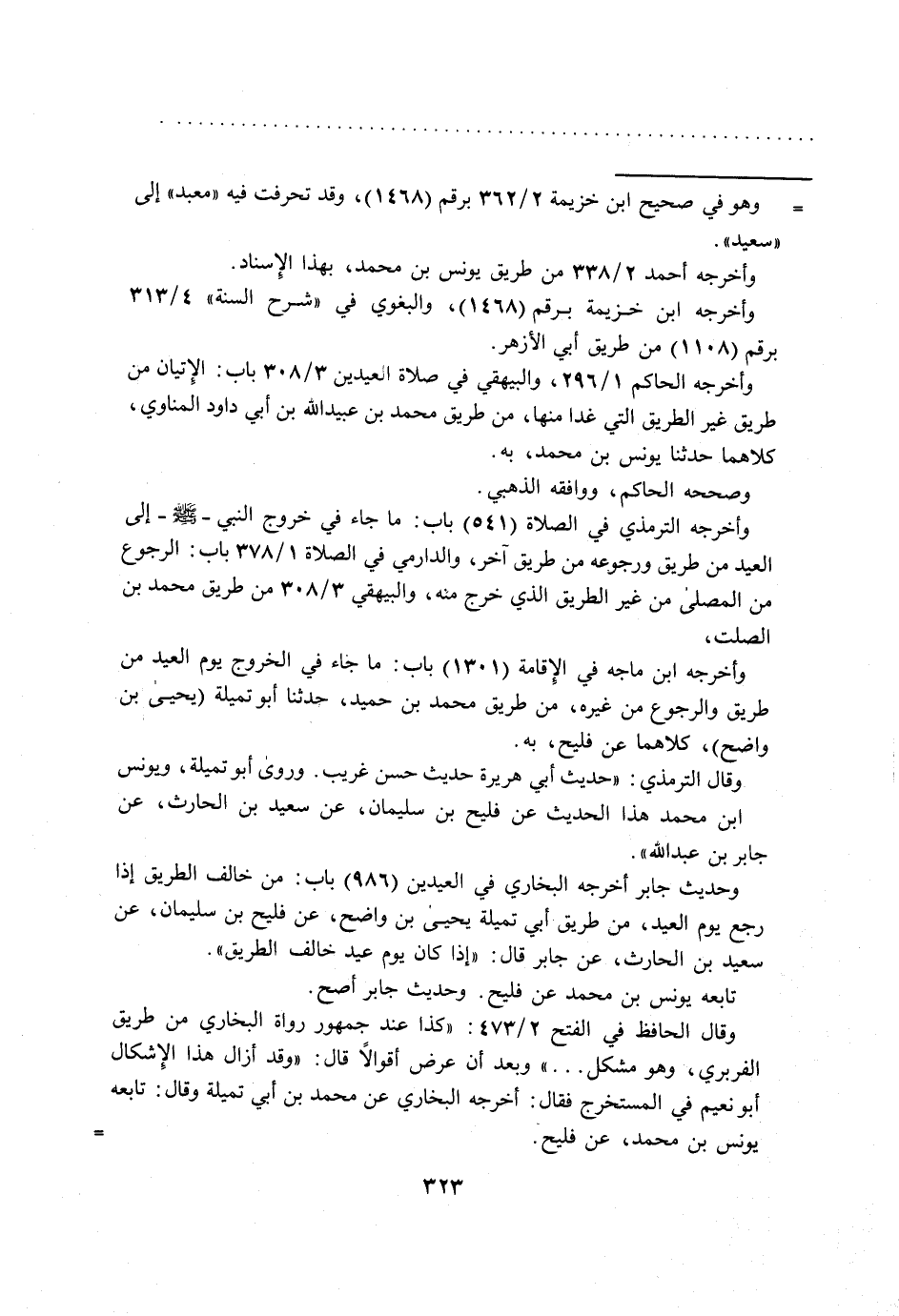 وقال الترمذي: "حديث أبي هريرة حديث حسن غريب. وروى أبو تميلة، ويونس ابن محمد هذا الحديث عن فليح بن سليمان، عن سعيد بن الحارث، عن جابر بن عبد الله". وحديث جابر أخرجه البخاري في العيدين (986) باب: من خالف الطريق إذا رجع يوم العيد، من طريق أبي تميلة يحيى بن واضح، عن فليح بن سليمان، عن سعيد بن الحارث، عن جابر قال: "إذا كان يوم عيد خالف الطريق". تابعه يونس بن محمد عن فليح. وحديث جابر أصح.