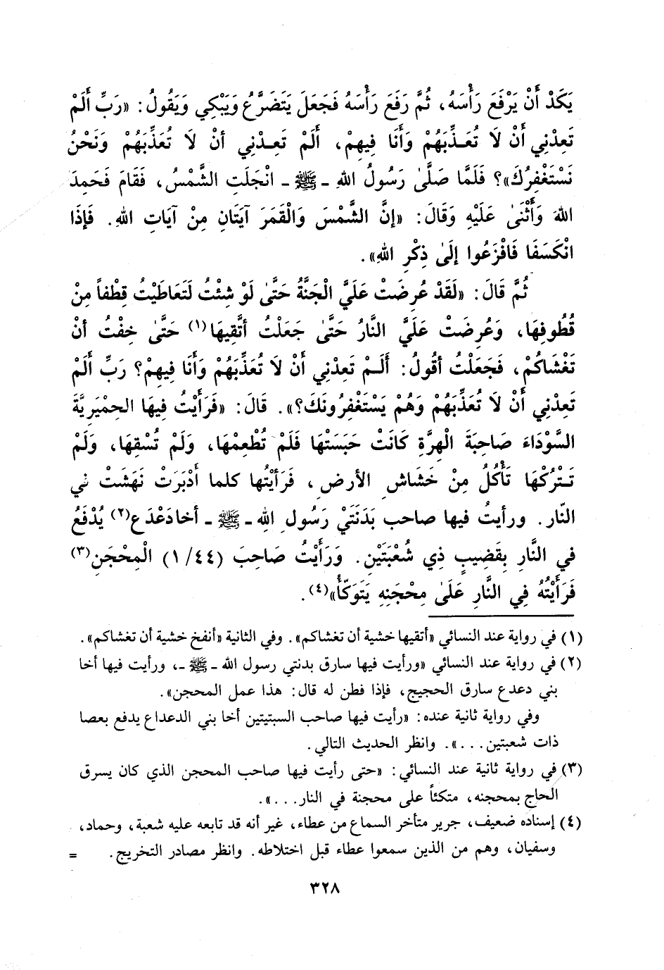 يَكَدْ أنْ يَرْفَعَ رَأْسَهُ، ثُمَّ رَفَعَ رَاأْسَهُ فَجَعَلَ يَتَضَرع وَيبْكِي وَيقُولُ: "رَبِّ ألَمْ تَعِدْنِي أنْ لا تُعَذِّبَهُمْ وَأنَا فِيهِمْ، ألَمْ تَعِدْنِي أنْ لا تُعَذِّبَهُمْ وَنَحْنُ نَسْتَغْفِرُكَ"؟ فَلَمَّا صَلَّى رَسُولُ اللهِ - صلى الله عليه وسلم - انْجَلَتِ الشَّمْسُ، فَقَامَ فَحَمِدَ اللهَ وَأثْنَى عَلَيْهِ وَقالَ: "إن الشمْسَ وَالْقَمَرَ آيَتَانِ مِنْ آيَاتِ اللهِ. فَإذَا انْكَسَفَا فَافْزَعُوا إلَى ذِكْرِ اللهِ". ثُم قَالَ: "لَقَدْ عُرِضَتْ عَلَى الْجَنَّةُ حَتَّى لَوْ شِئْتُ لَتَعَاطَيْتُ قِطْفاً مِنْ قُطُوفِهَا، وَعُرِضَتْ عَلَى النَّارُ حَتَّى جَعَلْتُ أتَّقِيهَا (¬1) حَتَّى خِفْتُ أنْ تَغْشَاكُمْ، فَجَعَلْتُ أقُولُ: أَلَمْ تَعِدْنِي أنْ لاَ تُعَذِّبَهُمْ وَأنَا فِيهِمْ؟ رَبِّ ألَمْ تَعِدْنِي أَنْ لاَ تُعَذِّبَهُمْ وَهُمْ يَسْتَغْفِرُونَكَ؟ ". قَالَ: "فَرَأيْتُ فِيهَا الحِمْيَريَّةَ السَّوْدَاءَ صَاحِبَةَ الْهِرَّةِ كَانَتْ حَبَسَتْهَا فَلَمْ- تُطْعِمْهَا، وَلَمْ تُسْقِهَا، وَلَمْ تَتْرُكهَا تَأْكُلُ مِنْ خَشَاشِ الأرضِ، فَرَأيْتُها كلما أدْبَرَتْ نَهَشَتْ في النّار. ورأيتُ فيها صاحب بَدَنَتَي رَسُولِ اللِّه - صلى الله عليه وسلم - أخا دَعْدَع (¬2) يُدْفَعُ في النَّارِ بِقَضِيبٍ ذِي شُعْبَتَيْنِ. وَرَأيْتُ صَاحِبَ (44/ 1) الْمِحْجَنِ (¬3) فَرَأيْتُهُ فِي النَّارِ علَى مِحْجَنِهِ يَتَوَكّأُ" (¬4).