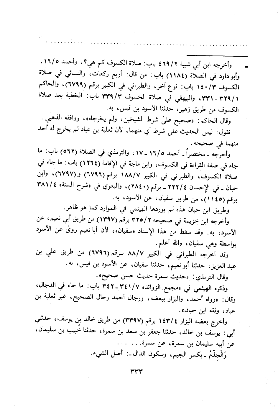 وقال الحاكم: "صحيح على شرط الشيخين، ولم يخرجاه"، ووافقه الذهبي. نقول: ليس الحديث على شرط أي منهما، لأن ثعلبة بن عباد لم يخرج له أحد منهمافي صحيحه. وأخرجه -مختصراً- أحمد 5/ 16 - 17، والترمذي في الصلاة (562) باب: ما جاء في صفة القراءة في الكسوف، وابن ماجة في الإِقامة (1264) باب: ما جاء في صلاة الكسوف، والطبراني في الكبير 7/ 188 برقم (6796) و (6797)، وابن حبان- في الإِحسان 4/ 222 - برقم (2840)، والبغوي في "شرح السنة" 4/ 381 برقم (1145)، من طريق سفيان، عن الأسود، به. وطريق ابن حبان هذه لم يوردها الهيثمي في الموارد كما هو ظاهر.