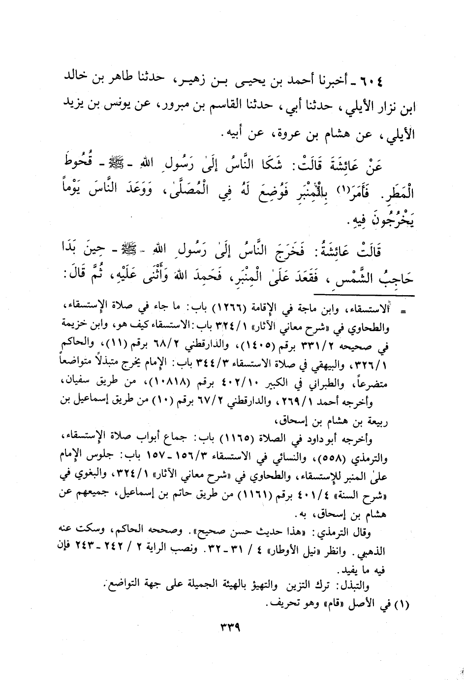 وأخرجه أبو داود في الصلاة (1165) باب: جماع أبواب صلاة الإِستسقاء، والترمذي (558)، والنسائي في الاستسقاء 3/ 156 - 157 باب: جلوس الإِمام على المنبر للإستسقاء، والطحاوي في "شرح معاني الآثار" 1/ 324، والبغوي في "شرح السنة" 4/ 401 برقم (1161) من طريق حاتم بن إسماعيل، جميعهم عن هشام بن إسحاق، به.