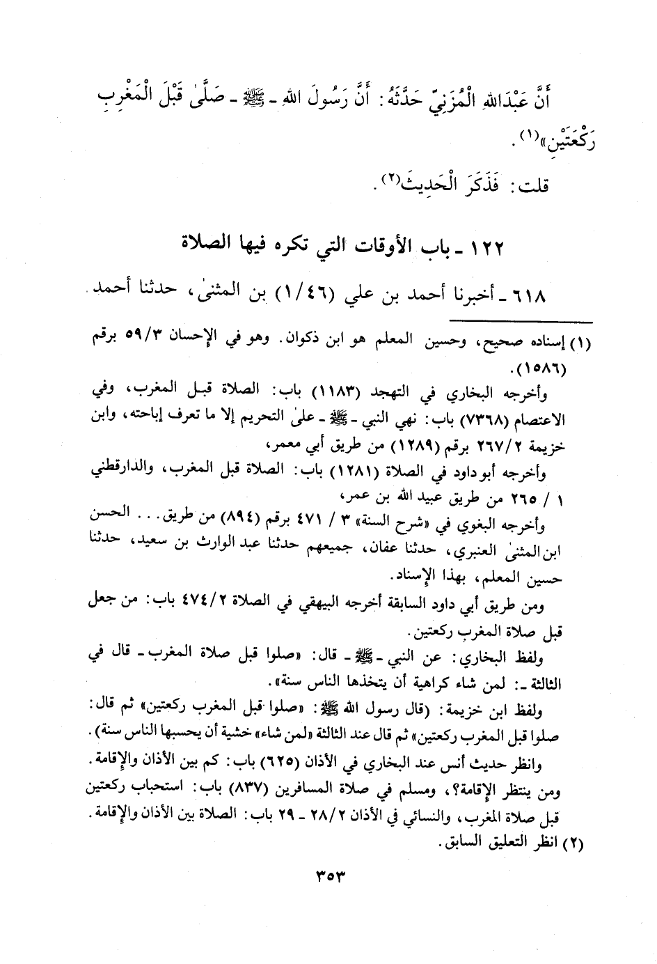 وأخرجه البخاري في التهجد (1183) باب: الصلاة قبل المغرب، وفي الاعتصام (7368) باب: نهي النبي - صلى الله عليه وسلم - على التحريم إلا ما تعرف إباحته، وابن خزيمة 2/ 267 برقم (1289) من طريق أبي معمر،