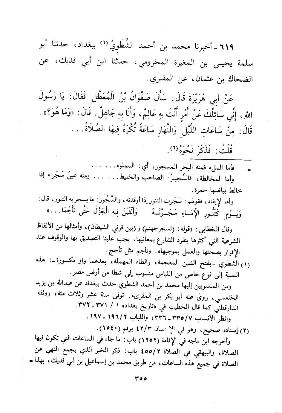 عَنْ أبِي هُرَيْرَةَ قَالَ: سَأَلَ صَفْوَانُ بْنُ الْمُعَطَّلِ فَقَالَ: يَا رَسُولَ اللهِ، إِنِّي سَائِلُكَ عَنْ أَمْرٍ أَنْتَ بِهِ عَالِمٌ، وَأَنَا بِهِ جَاهِلٌ. قَالَ: "وَمَا هُوَ؟ ". قَالَ: مِنْ سَاعَاتِ اللَّيْلِ وَالنَّهَارِ سَاعَةٌ تُكْرَهُ فِيهَا الصَّلاةُ ... قُلْتُ: فَذَكَرَ نَحْوَهُ (¬2).