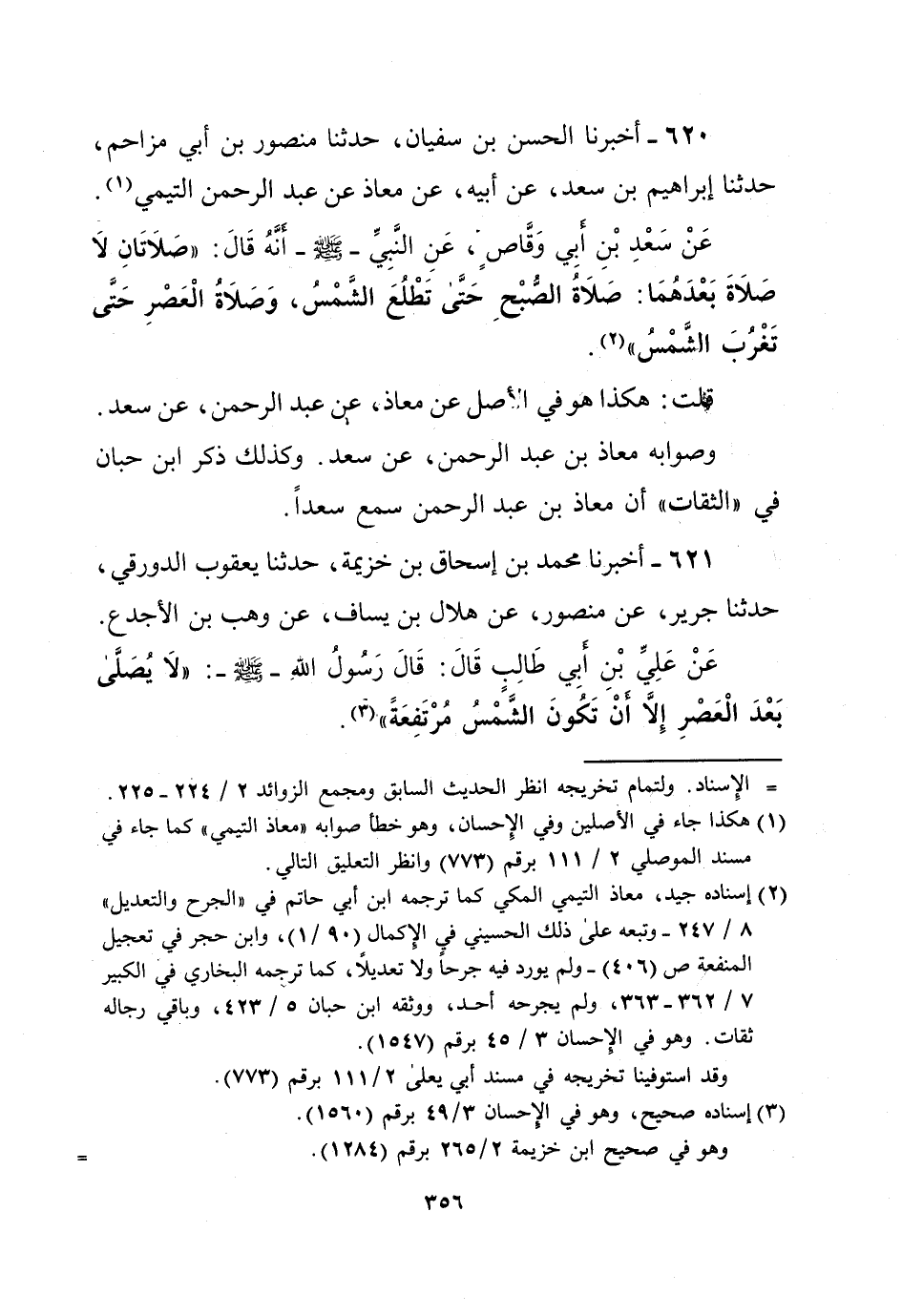 عَنْ سَعْدِ بْنِ أَبِي وَقَّاصٍ، عَنِ النَّبِيِّ - صلى الله عليه وسلم - أَنَّهُ قَالَ: "صَلاَتَانِ لا صَلاَةَ بَعْدَهُمَا: صَلاَةُ الصُّبْحِ حَتَّى تَطْلُعَ الشَمْسُ، وَصَلاَةُ الْعَصْرِ حَتَّى تَغْرُبَ الشمْسُ" (¬2).