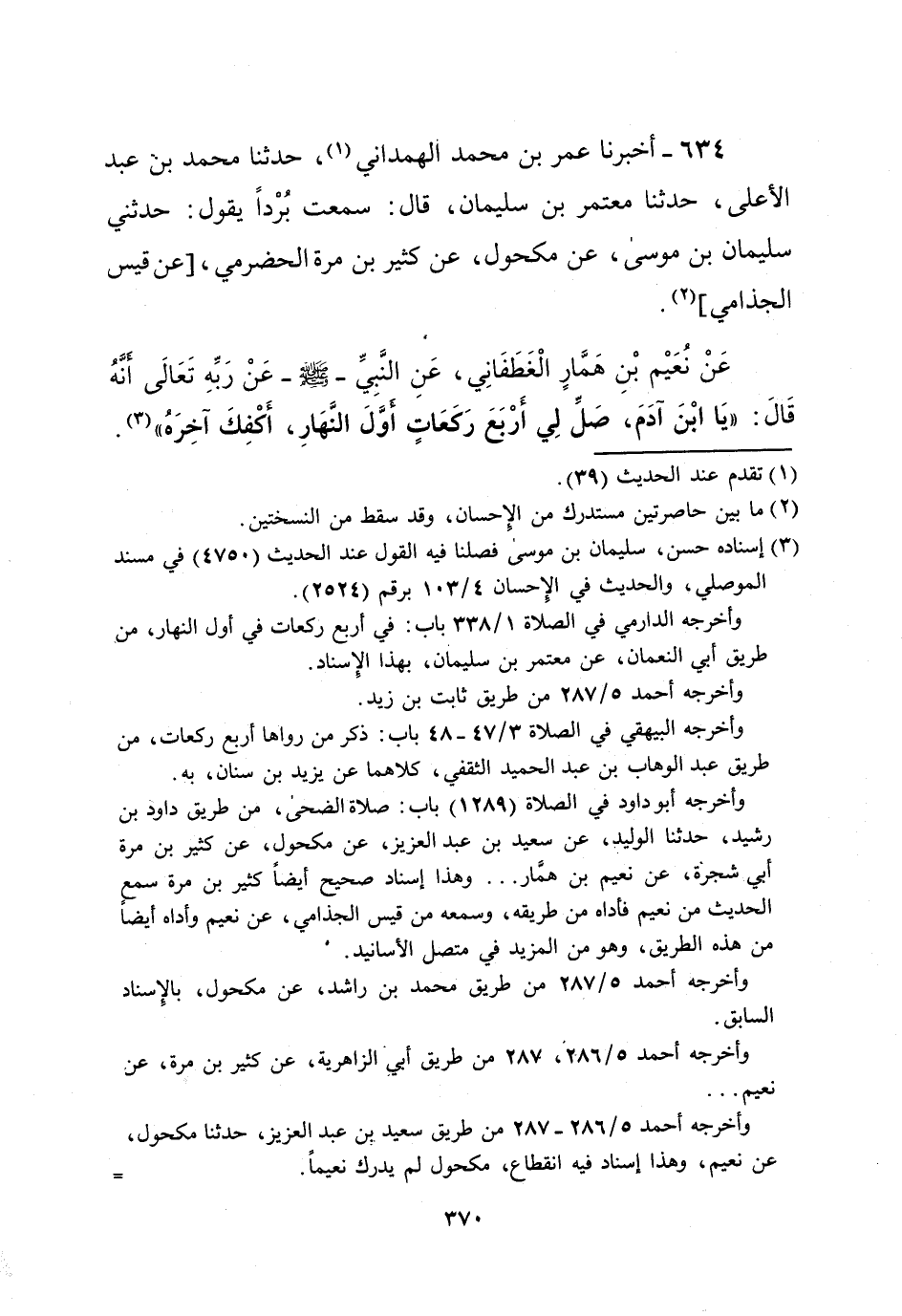 عَنْ نُعَيْم بْنِ هَمَّارٍ الْغَطَفَانِي، عَنِ النَّبِيِّ - صلى الله عليه وسلم - عَنْ رَبِّه تَعَالَى أنَّهُ قَالَ: "يَا ابْنَ آدَمَ، صَلِّ لِي أَرْبَعَ رَكَعَاتٍ أوَّلَ النَّهَارِ، أَكلفِكَ آخِرَهُ" (¬3).