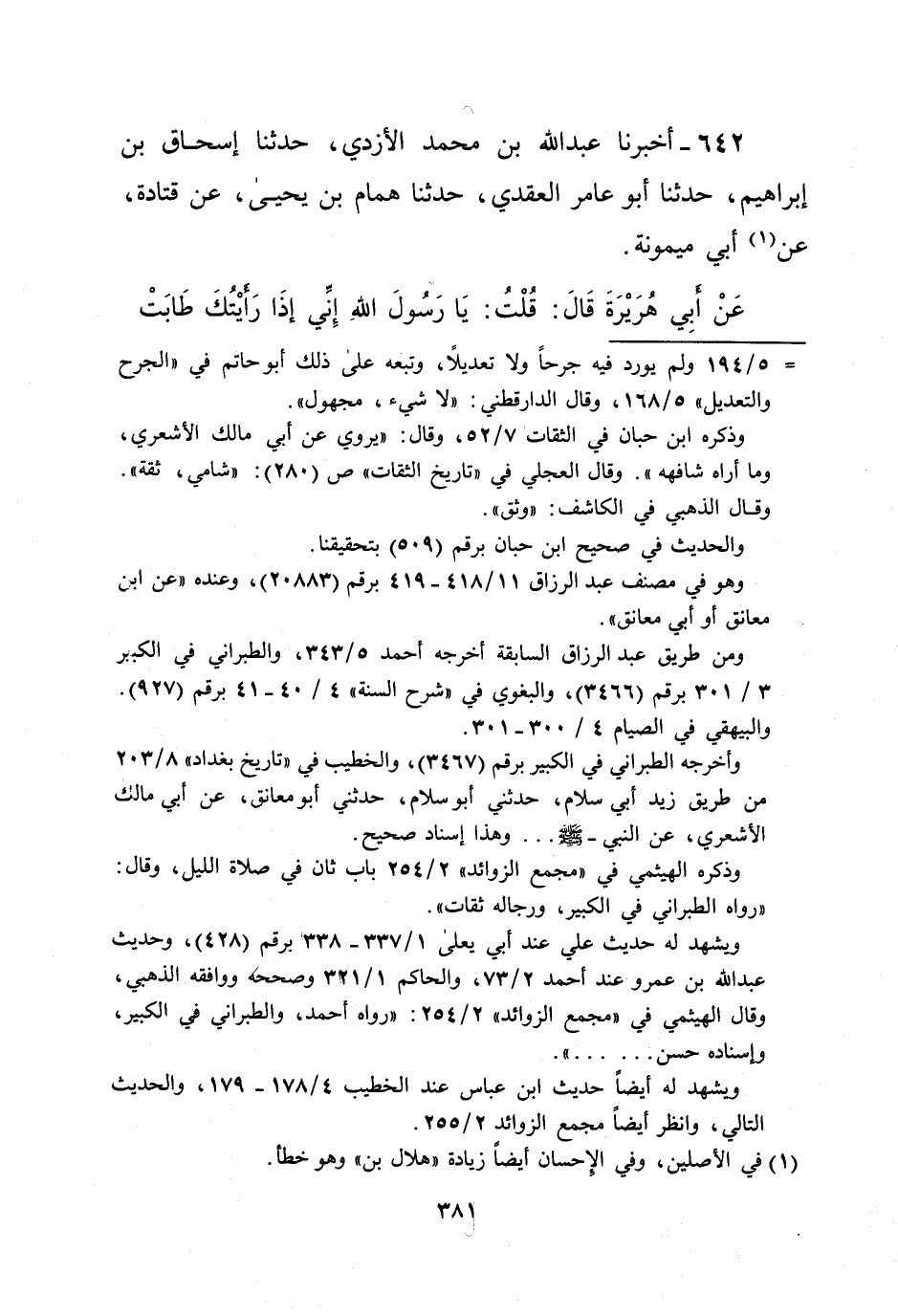 642 - أخبرنا عبد الله بن محمد الأزدي، حدثنا إسحاق بن إبراهيم، حدثنا أبو عامر العقدي، حدثنا همام بن يحيى، عن قتادة، عن (¬1) أبي ميمونة.
