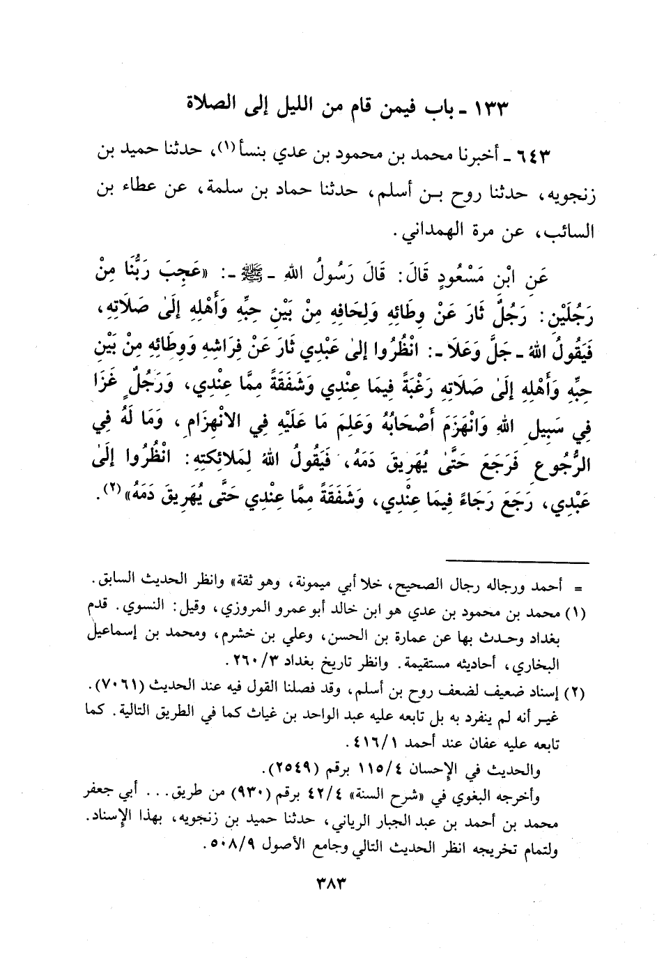 عَنِ ابْنِ مَسْعُودٍ قَالَ: قَالَ رَسُولُ اللهِ - صلى الله عليه وسلم -: "عَجِبَ رَبُّنا مِنْ رَجُلَيْنِ: رَجُلٌ ثَارَ عَنْ وِطَائِهِ وَلِحَافِهِ مِنْ بَيْنِ حِبِّهِ وَأهْلِهِ إلَى صَلاتِهِ، فَيَقُولُ اللهُ -جَلَّ وَعَلا-: انْظُرُوا إلى عَبْدِي ثَارَ عَنْ فِرَاشِهِ وَوِطَائِهِ مِنْ بَيْنِ حِبِّهِ وَأهْلِهِ إلَى صَلاتِهِ رَغْبَةً فِيمَا عِنْدِي وَشَفَقَةً مِمَّا عِنْدِي، وَرَجُلٌ غَزَا فِي سَبِيلِ اللهِ وَانْهَزَمَ أصْحَابُهُ وَعَلِمَ مَا عَلَيْهِ فِي الانْهِزَامِ، وَمَا لَهُ فِي الرُّجُوعِ فَرَجَعَ حَتَّى يُهَرِيقَ دَمَهُ، َ فَيَقُولُ الله لِمَلائِكتِهِ: انْظُرُوا إلَى عَبْدِي، رَجَعَ رَجَاءً فِيمَا عِنْدِي، وَشَفَقَةً مِمَّا عِنْدِي حَتَّى يُهَرِيقَ دَمَهُ" (¬2).