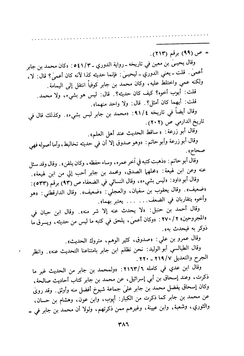 وقال أيضاً في تاريخه 4/ 91: "محمد بن جابر ليس بشيء". وكذلك قال في تاريخ الدارمي ص (202).
