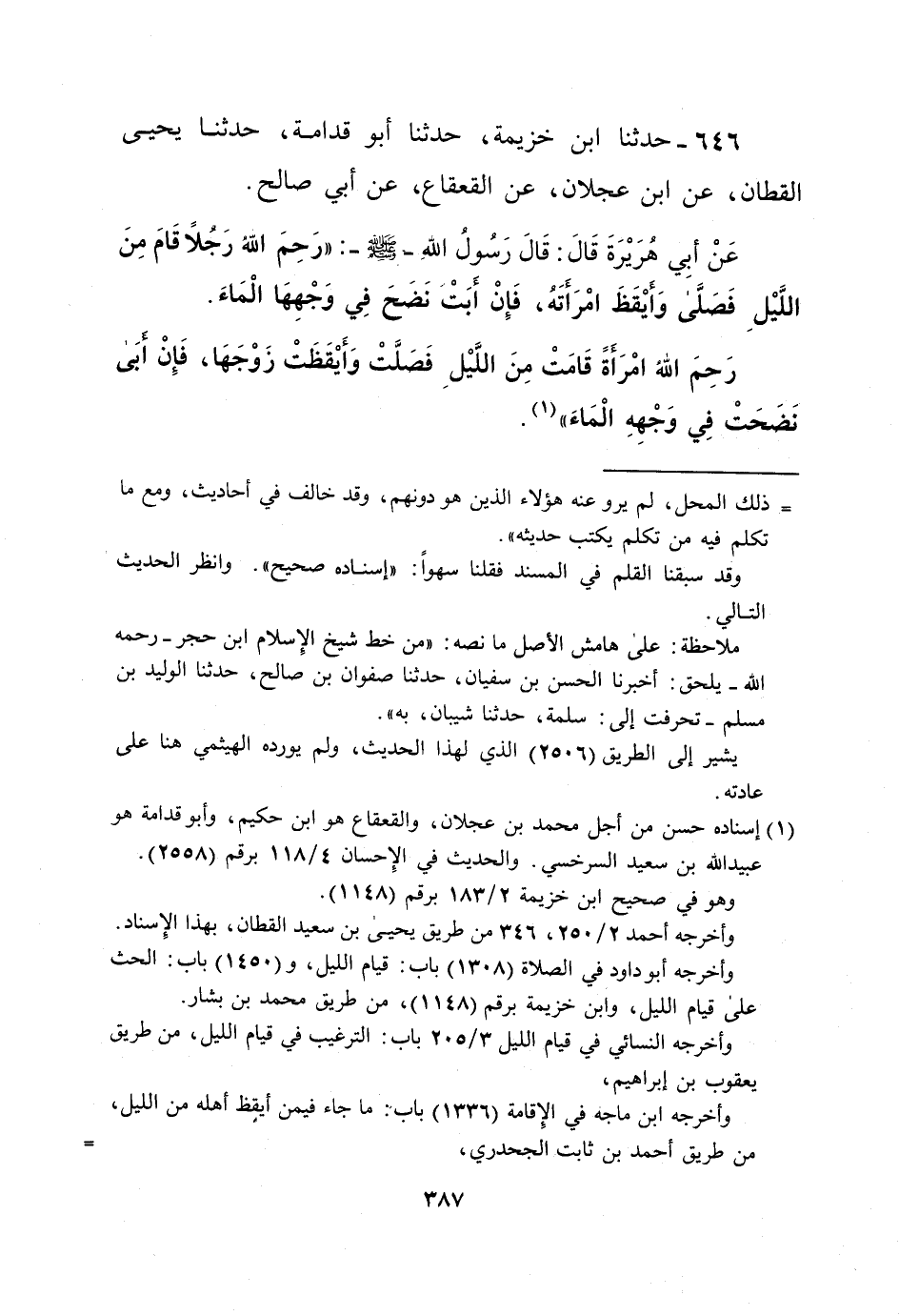 عَنْ أبِي هُرَيْرَةَ قَالَ: قَالَ رَسُولُ اللهِ - صلى الله عليه وسلم -: "رَحِمَ اللهُ رَجلاً قَامَ مِنَ اللَّيْلِ فَصَلَّى وَأيْقَظَ امْرَأَتَهُ، فَإِنْ أَبَتْ نَضَحَ فِي وَجْهِهَا الْمَاءَ. رَحِمَ اللهُ امْرَأَةً قَامَتْ مِنَ اللَّيْلِ فَصَلَّتْ وَأَيْقَظَتْ زَوْجَهَا، فَإِنْ أَبَى نَضَحَتْ فِي وَجْهِهِ الْمَاءَ" (¬1).