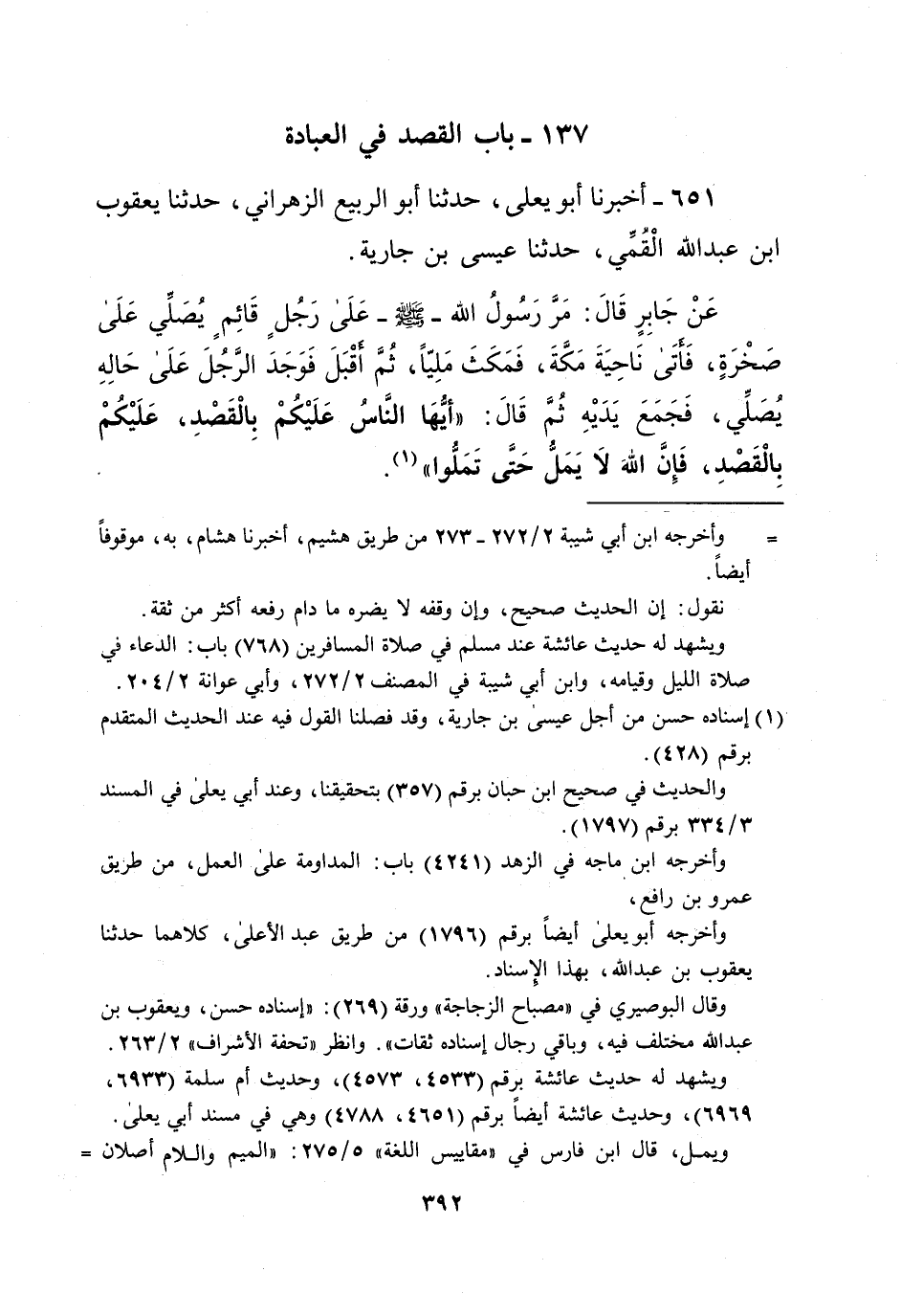 عَنْ جَابِرٍ قَالَ: مَرَّ رَسُولُ الله - صلى الله عليه وسلم - عَلَى رَجُلٍ قَائِمٍ يُصَلِّي عَلَى صَخْرَةٍ، فَأَتَى نَاحِيَةَ مَكَّةَ، فَمَكَثَ مَلِيّاً، ثُمَّ أَقْبَلَ فَوَجَدَ الرَّجُلَ عَلَى حَالِهِ يُصَلِّي، فَجَمَعَ يَدَيْهِ ثُمَّ قَالَ: "أيُّهَا النَّاسُ عَلَيْكُمْ بِالْقَصْدِ، عَلَيْكُمْ بِالْقَصْدِ، فَإِنَّ اللهَ لا يَمَلُّ حَتَّى تَمَلُّوا" (¬1).