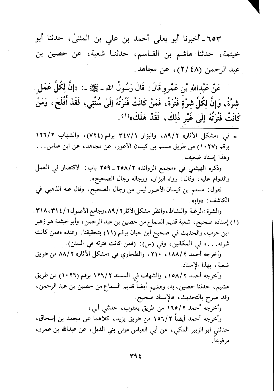 653 - أخبرنا أبو يعلى أحمد بن علي بن المثنى، حدثنا أبو خيثمة-، حدتتا هاشم بن القاسم، حدثنا شعبة، عن حصين بن عبد الرحمن (48/ 2)، عن مجاهد.