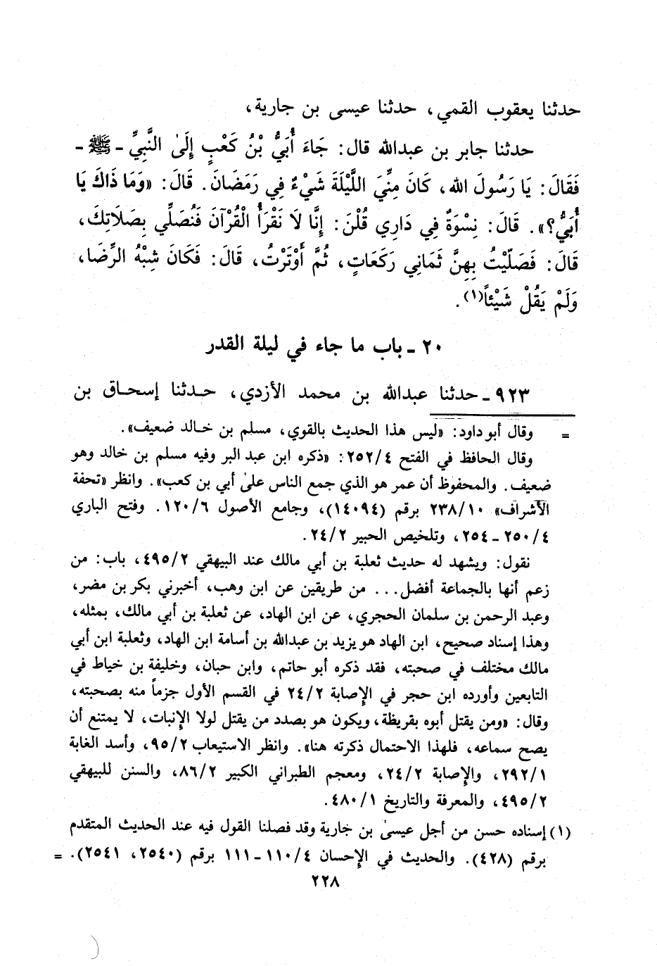 حدثنا جابر بن عبد الله قال: جَاءَ أُبَي بْنُ كَعْبٍ إلَى النَّبِيِّ -صلى الله عليه وسلم- فَقَالَ: يَا رسول الله، كَانَ مِنِّيَ اللَّيْلَةَ شَيْءٌ فِي رَمَضَانَ. قَالَ: "وَمَا ذَاكَ يَا أُبَيُّ؟ ". قَالَ: نِسْوَةٌ فِي دَارِي قُلْنَ: إِنَّا لا نَقْرأُ الْقُرْآنَ فَنُصَلِّي بِصَلاَتِكَ، قَالَ: فَصَلّيْتُ بِهِنَّ ثَمَانِي رَكَعَاتٍ، ثُمَّ أَوْتَرْتُ، قَالَ: فَكَانَ شِبْهُ الرِّضَا، وَلَمْ يَقُلْ شَيْئاً (¬1).