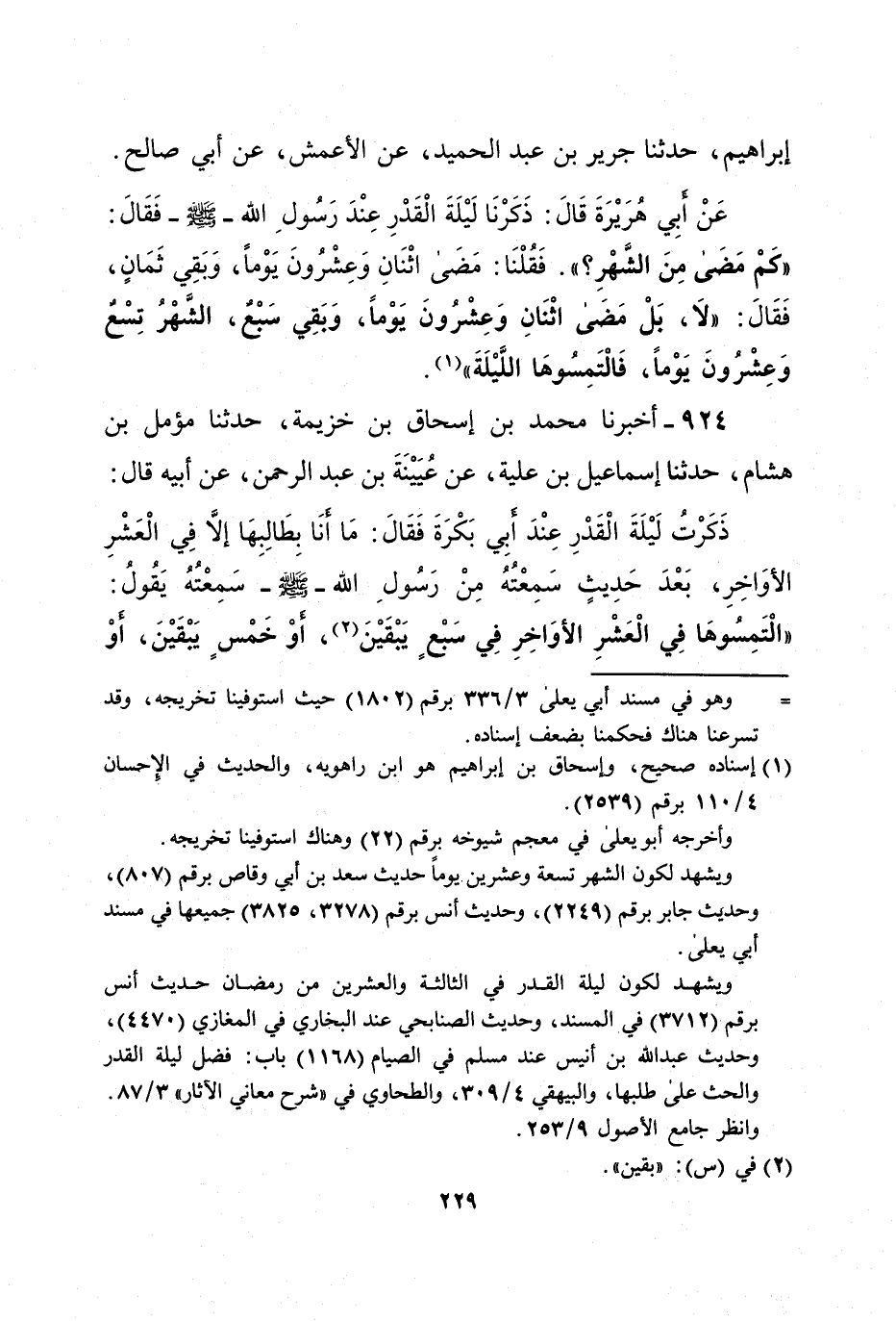 ويشهد لكون الشهر تسعة وعشرين يوماً حديث سعد بن أبي وقاص برقم (807)، وحديث جابر برقم (2249)، وحديث أَنس برقم (3278، 3825) جميعها في مسند أبي يعلى. ويشهد لكون ليلة القدر في الثالثة والعشرين من رمضان حديث أَنس برقم (3712) في المسند، وحديث الصنابحي عند البخاري في المغازي (4470)، وحديث عبد إلا بن أنيس عند مسلم في الصيام (1168) باب: فضل ليلة القدر والحث على طلبها، والبيهقي4/ 309، والطحاوي في "شرح معاني الآثار" 3/ 87. وانظر جامع الأصول 9/ 253.