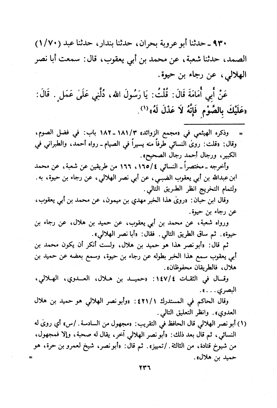 930 - حدثنا أبو عروبة بحران، حدثنا بندار، حدثنا عبد (70/ 1) الصمد، حدثنا شعبة، عن محمد بن أبي يعقوب، قال: سمعت أبا نصر الهلالي، عن رجاء بن حيوة.