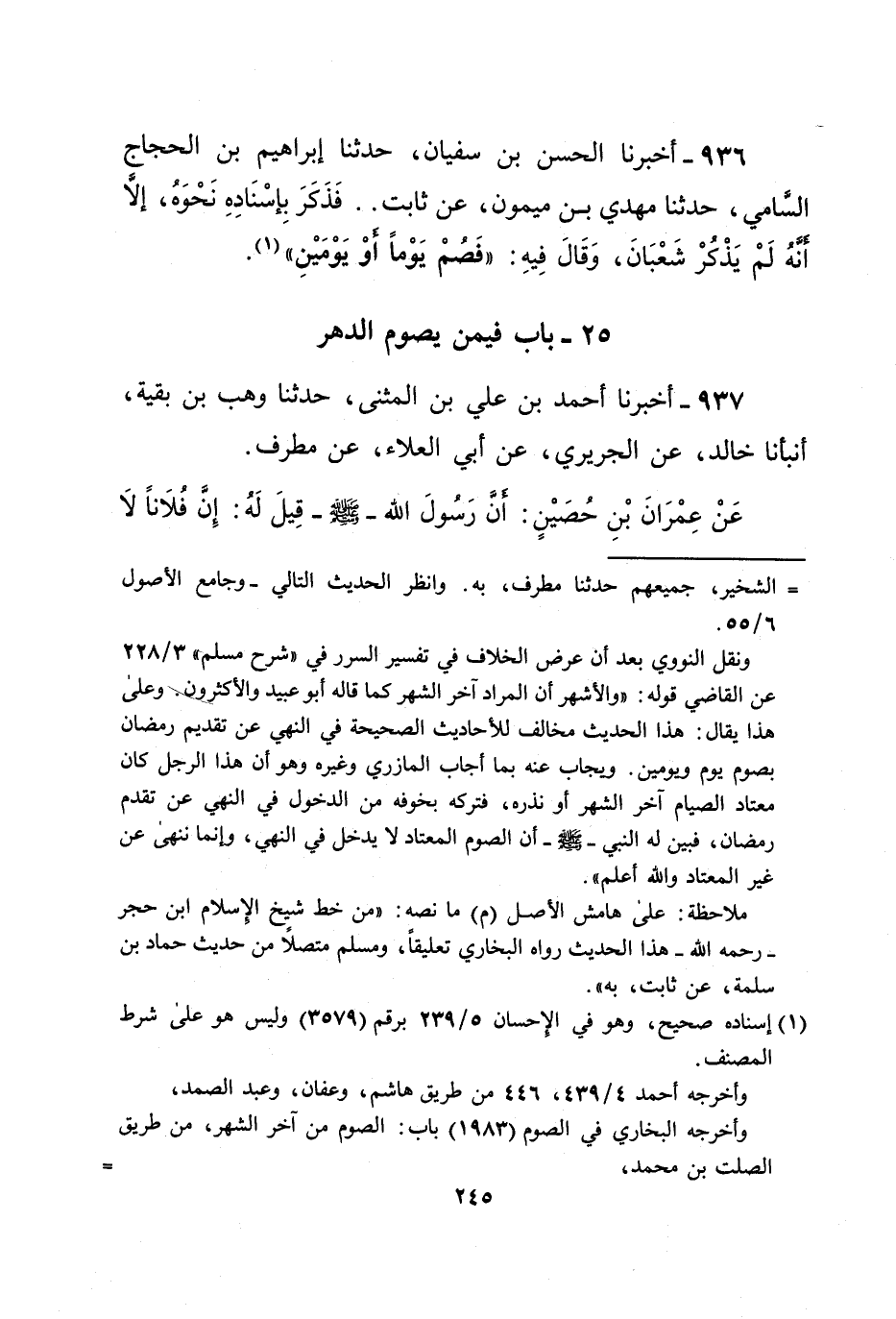 936 - أخبرنا الحسن بن سفيان، حدثنا إبراهيم بن الحجاج السَّامي، حدثنا مهدي بن ميمون، عن ثابت .. فَذَكَرَ بِإسْنَادِهِ نَحْوُه، الاَّ أنَّهُ لَمْ يَذْكُرْ شَعْبَانَ، وَقَالَ فِيهِ: "فَصُمْ يَوْماً أوْ يَوْمَيْنِ" (¬1).
