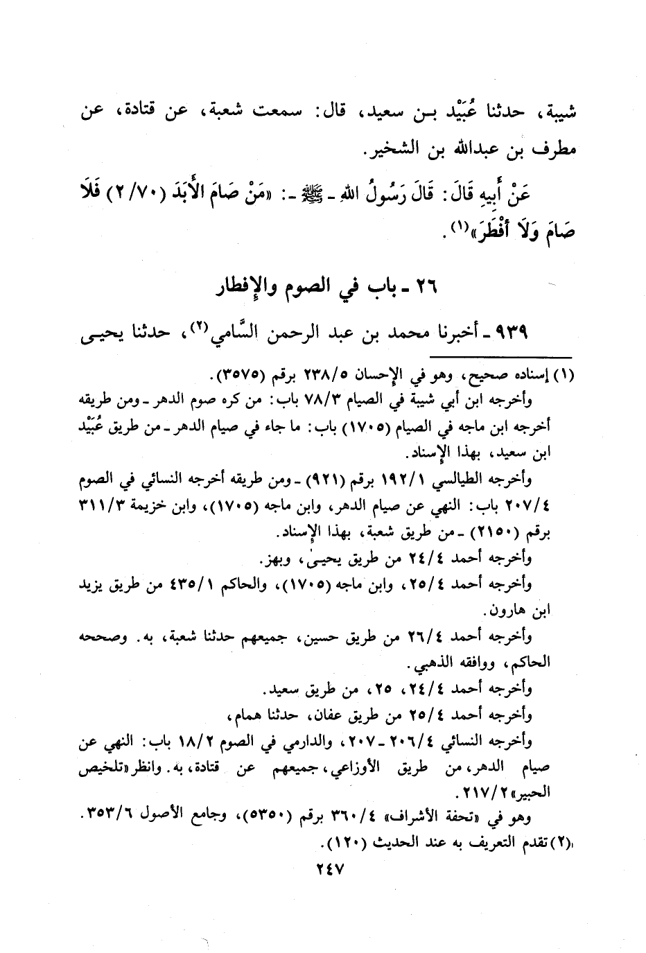 وأخرجه ابن أبي شيبة في الصيام 3/ 78 باب: من كره صوم الدهر- ومن طريقه أخرجه ابن ماجه في الصيام (1705) باب: ما جاء في صيام الدهر- من طريق عُبَيْد ابن سعيد، بهذا الإسناد.