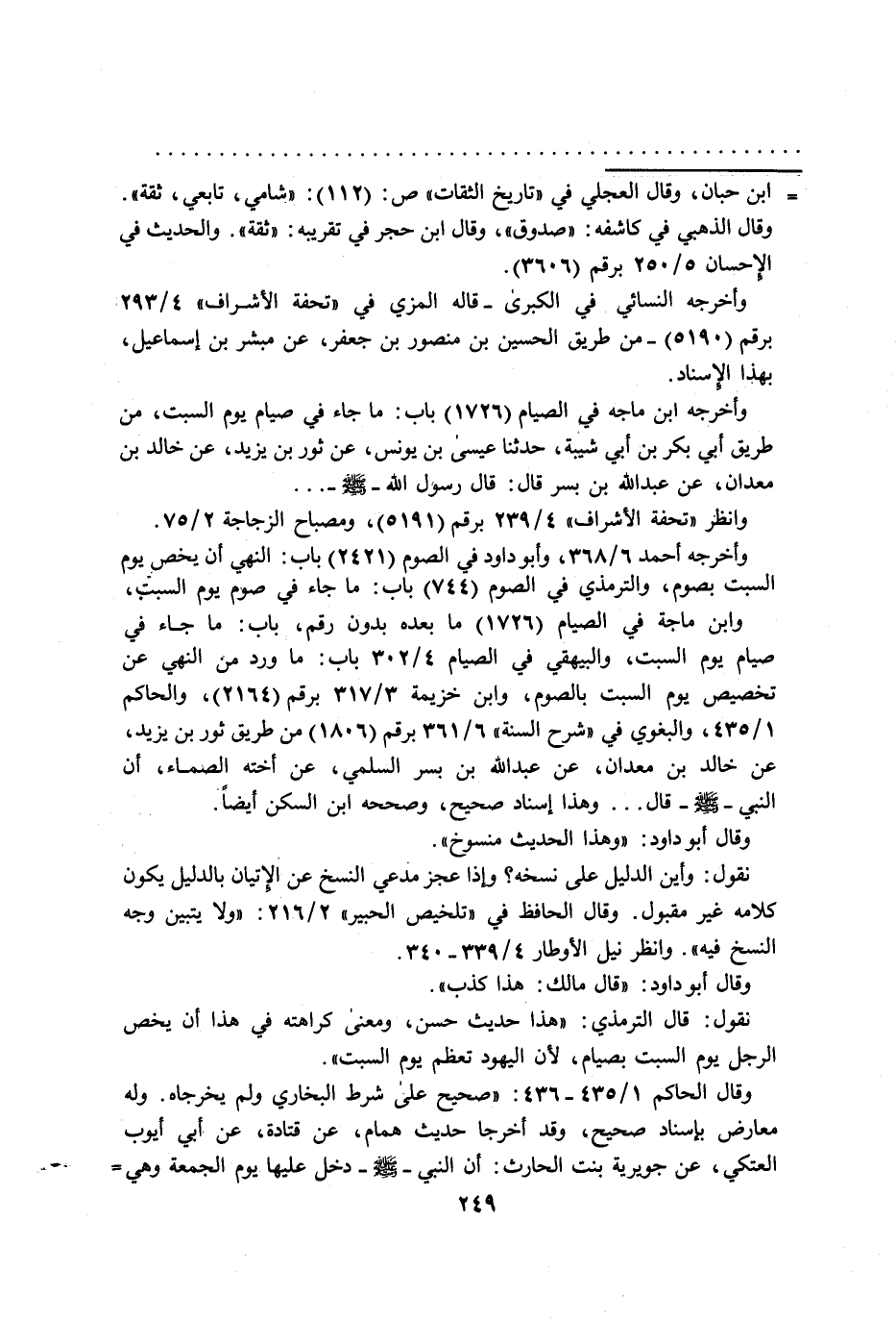 وانظر "تحفة الأشراف" 4/ 239 برقم (5191)، ومصباح الزجاجة 2/ 75. وأخرجه أحمد 6/ 368، وأبو داود في الصوم (2421) باب: النهي أن يخص يوم السبت بصوم، والترمذي في الصوم (744) باب: ما جاء في صوم يوم السبت، وابن ماجة في الصيام (1726) ما بعده بدون رقم، باب: ما جاء في صيام يوم السبت، والبيهقي في الصيام 4/ 302 باب: ما ورد من النهي عن تخصيص يوم السبت بالصوم، وابن خزيمة 3/ 317 برقم (2164)، والحاكم 1/ 435، والبغوي في "شرح السنة" 6/ 361 برقم (1806) من طريق ثور بن يزيد، عن خالد بن معدان، عن عبد الله بن بسر السلمي، عن أخته الصماء، أن النبي -صلى الله عليه وسلم- قال ... وهذا إسناد صحيح، وصححه ابن السكن أيضاً".