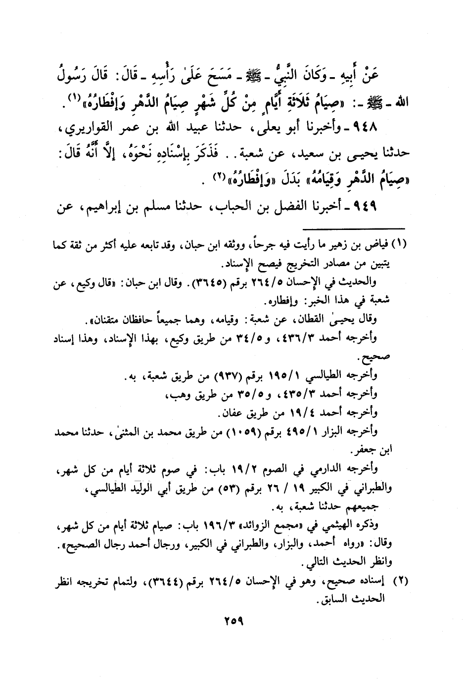 948 - وأخبرنا أبو يعلى، حدثنا عبيد الله بن عمر القواريري، حدثنا يحيى بن سعيد، عن شعبة .. فَذَكَرَ بِإسْنَادِهِ نَحْوَهُ، إلاَ أنَّهُ قَالَ: "صيام الدَّهْرِ وَقِيَامُهُ" بَدَلَ "وَإفْطَارُهُ" (¬2).