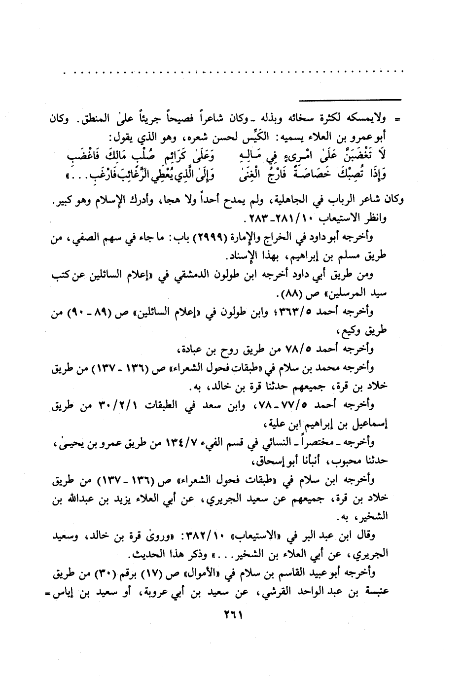 وأخرجه ابن سلام في "طبقات فحول الشعراء" ص (136 - 137) من طريق خلاد بن قرة، جميعهم عن سعيد الجريري، عن أبي العلاء يزيد بن عبد الله بن الشخير، به.