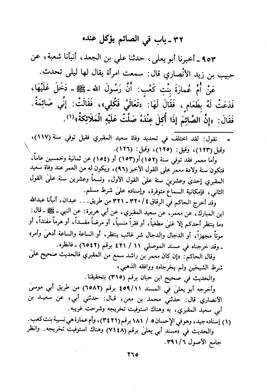 عَنْ أُمِّ عُمارَةَ بِنْتِ كَعْبِ: أنَّ رسول الله -صلى الله عليه وسلم- دَخَلَ عَلَيْهَا، فَدَعَتْ لَهُ بِطَعَامٍ، فَقَالَ لَهَا: َ "تَعَالَيْ فَكُلِي"، فَقَالَتْ: إِنِّي صَائِمَة. فَقَالَ: "إِنَّ الصَّائِمَ إذَا أُكلَ عِنْدَهُ صَلَّتْ عَلَيْهِ الْمَلائِكةُ" (¬1).