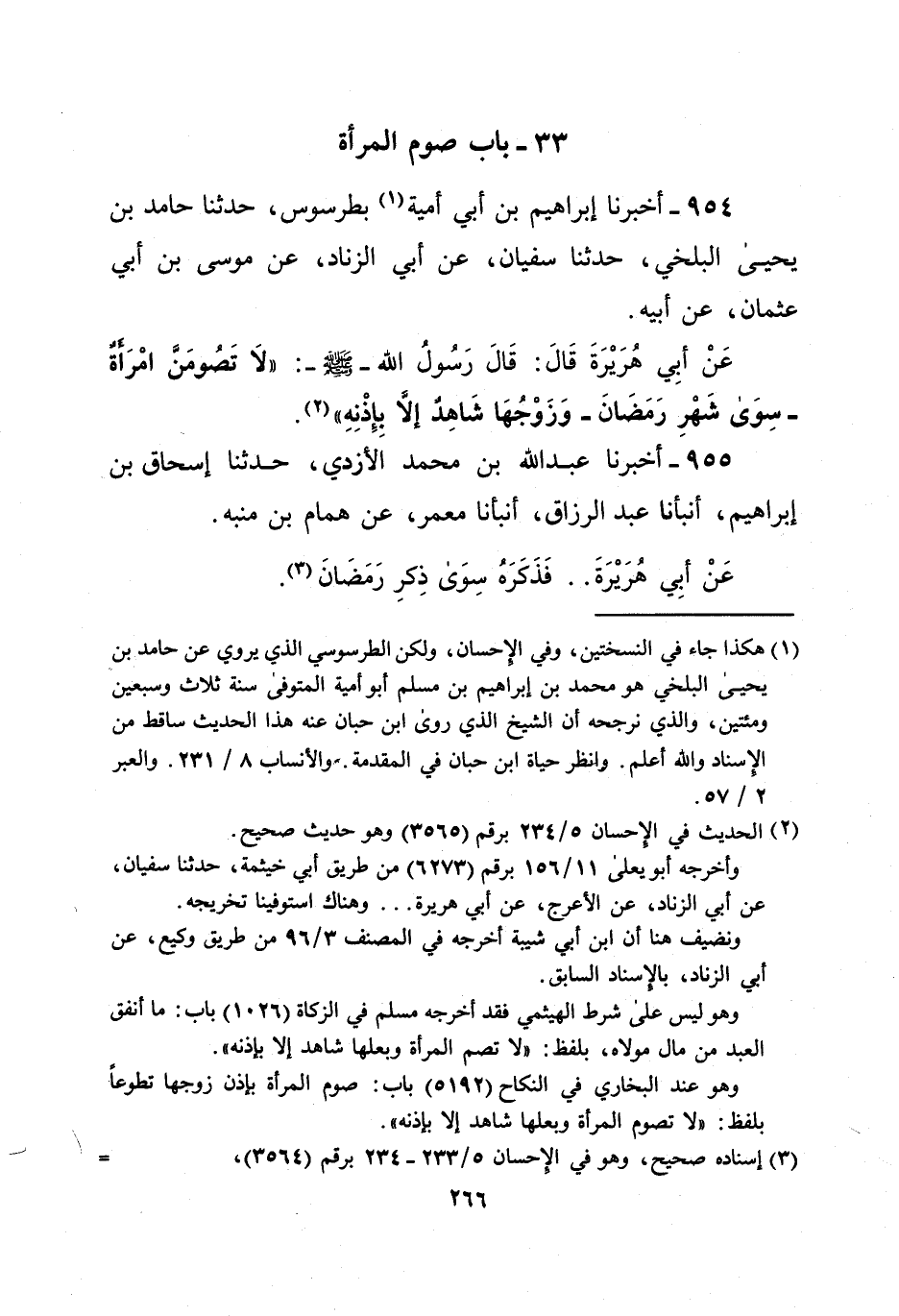 (¬1) هكذا جاء في النسختين، وفي الإحسان، ولكن الطرسوسي الذي يروي عن حامد بن يحيى البلخي هو محمد بن إبراهيم بن مسلم أبو أمية المتوفى سنة ثلاث وسبعين ومئتين، والذي نرجحه أن الشيخ الذي روى ابن حبان عنه هذا الحديث ساقط من الإسناد والله أعلم. وانظر حياة ابن حبان في المقدمة. "والأنساب 8/ 231. والعبر 2/ 57.