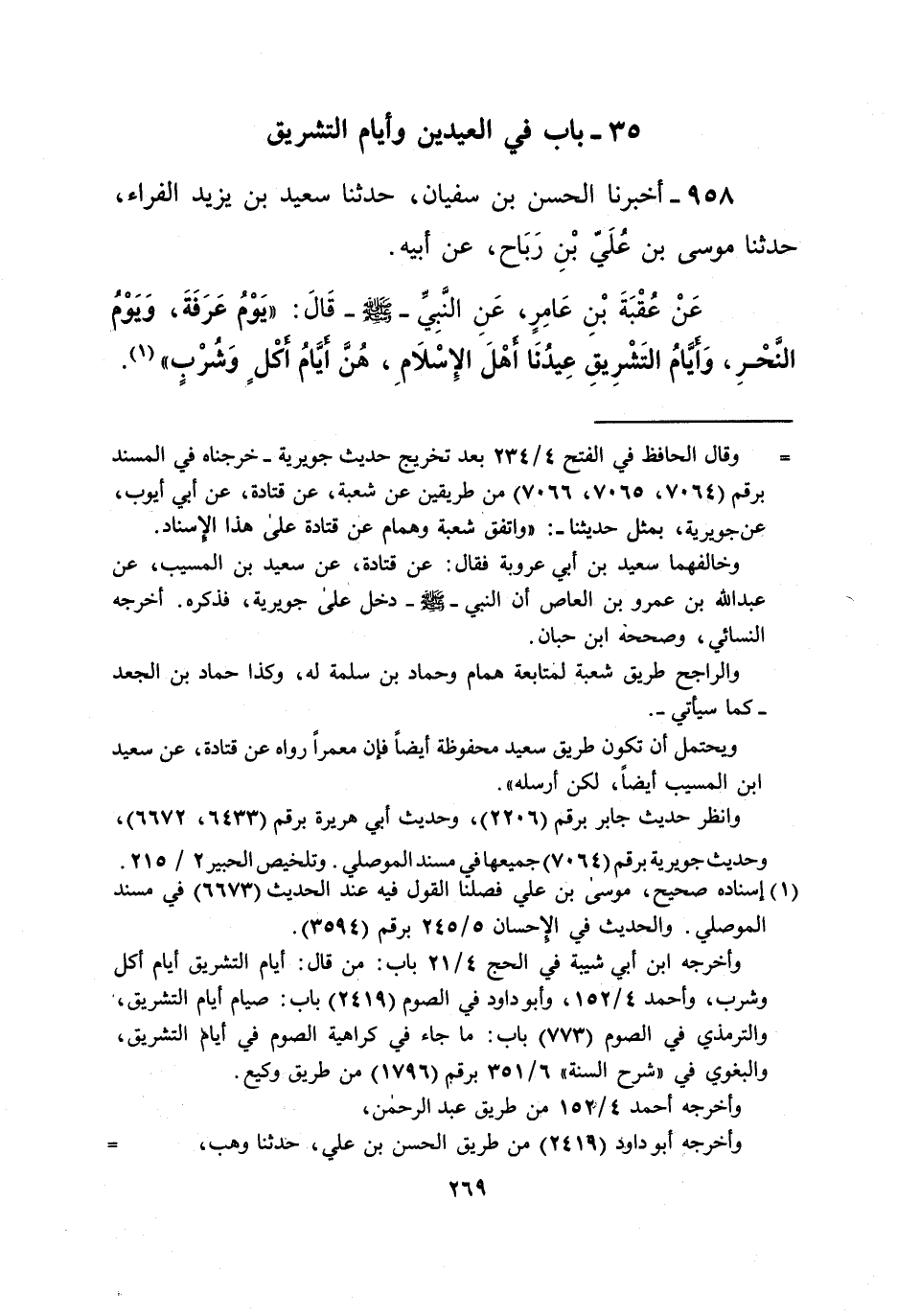 عَنْ عُقْبَةَ بْنِ عَامِر، عَنِ النَّبِيِّ -صلى الله عليه وسلم- قَالَ: "يَوْمُ عَرَفَةَ، وَيَوْم النَّحْرِ، وَأيَّامُ التَشْرِيقِ عِيدُنَا أهْلَ الإِسْلاَمِ، هُنَّ أيَّامُ أكْل وَشُرْبٍ" (¬1).