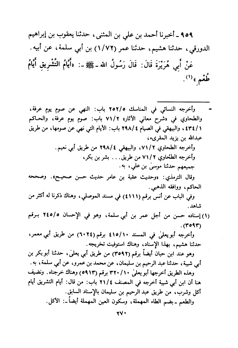 وهذه الطريق أخرجها أبو يعلى 10/ 320 برقم (5913) وهناك خرجناه. ونضيف هنا أن ابن أبى شيبة أخرجه في المصنف 4/ 21 باب: من قال: أيام التشريق أيام أكل وشرب، من طريق عبد الرحيم بن سليمان بالإسناد السابق.