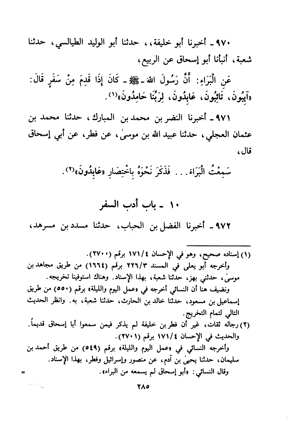 عَنِ الْبَرَاءِ: أَنَّ رَسُولَ اللهَ -صلى الله عليه وسلم- كَانَ إِذَا قَدِمَ مِنْ سَفَرٍ قَالَ: "آيِبُونَ، تَائِبُونَ، عَابِدُونَ، لِرَبِّنَا حَامِدُونَ" (¬1).
