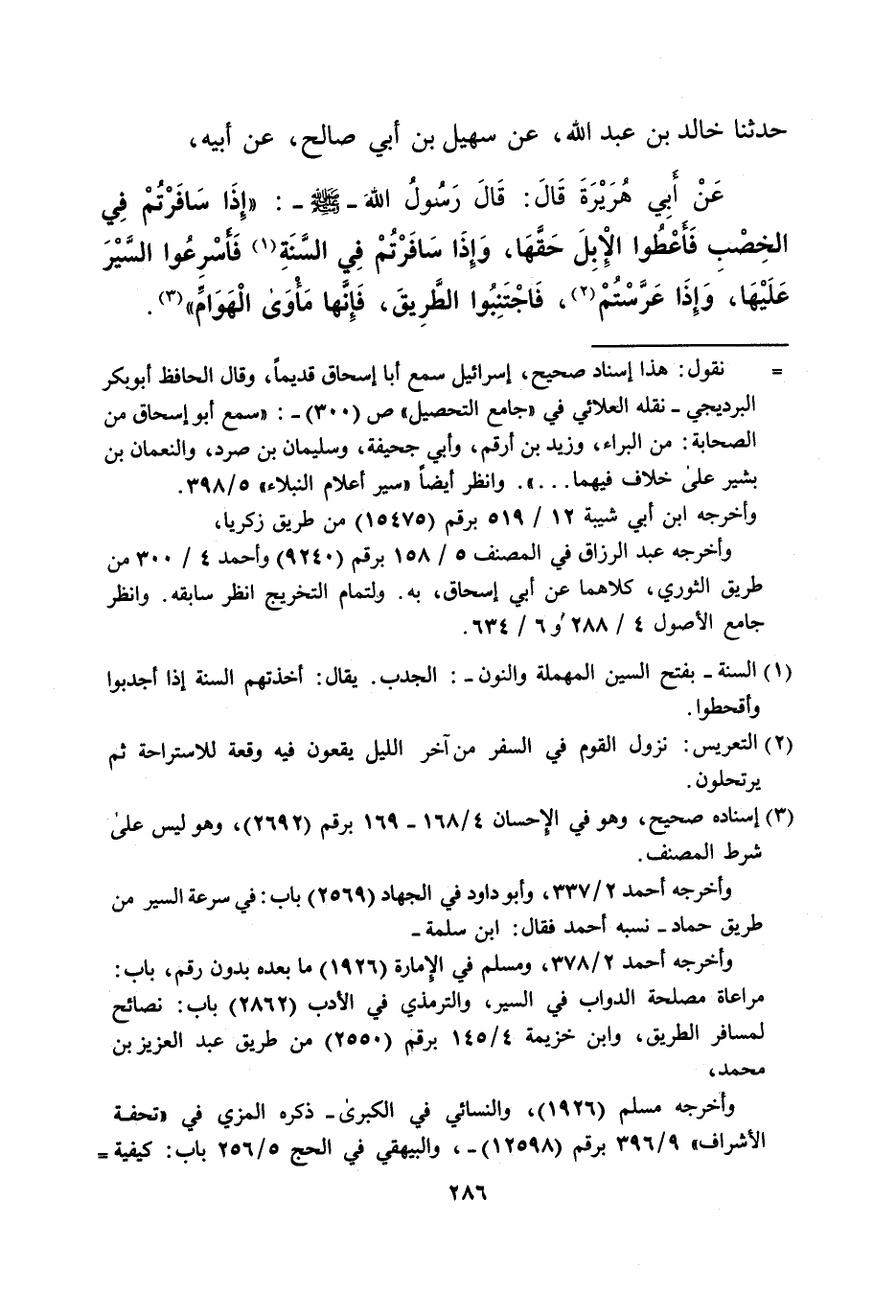 عَنْ أبِي هُرَيْرَةَ قَالَ: قَالَ رَسُولُ الله -صلى الله عليه وسلم-: "إِذَا سَافَرْتُمْ فِي الخِصْب فَأعْطُوا الإبِلَ حَقَّهَا، وَإِذا سَافَرْتُمْ فِي السَّنَةِ (¬1) فَأسْرِعُوا السَّيْرَ عَلَيْهَا، َ وَإِذَا عَرَّسْتُمْ (¬2)، فَاجْتَنِبُوا الطَّرِيقَ، فَإِنَّها مَأْوَى الْهَوَامِّ" (¬3).