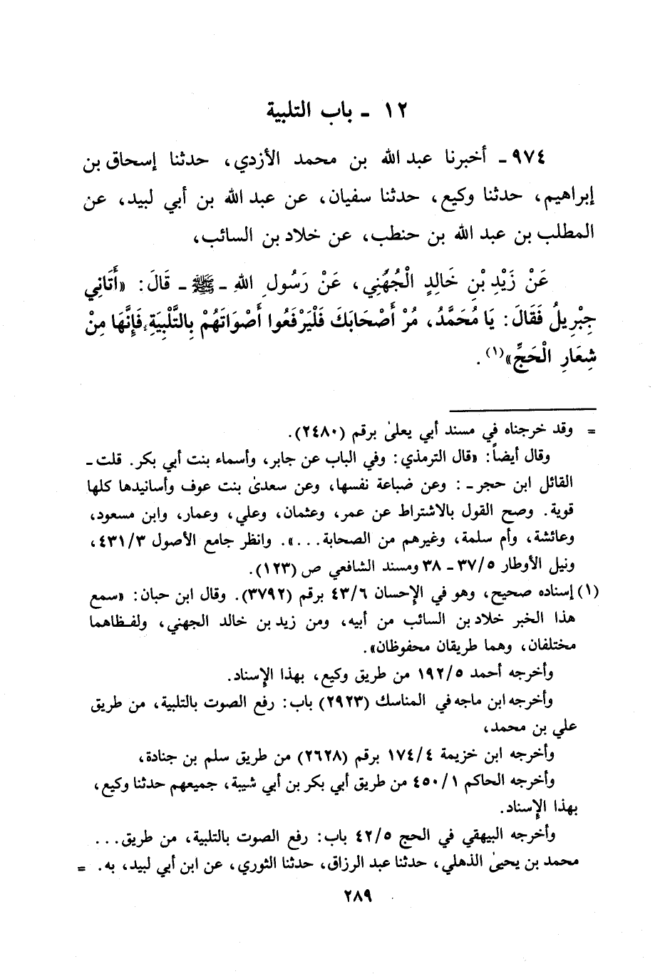 عَنْ زَيْدِ بْنِ خَالِدٍ الْجُهَنِي، عَنْ رَسُولِ اللهِ -صلى الله عليه وسلم- قَالَ: "أتَاني جِبْرِيلُ فَقَالَ: يَا مُحَمَّدُ، مُرْ أصْحَابَكَ فَلْيَرْفَعُوا أصْوَاتَهُمْ بِالتَّلْبِيَةِ فَإِنَّهَا مِنْ شِعَارِ الْحَجِّ" (¬1).