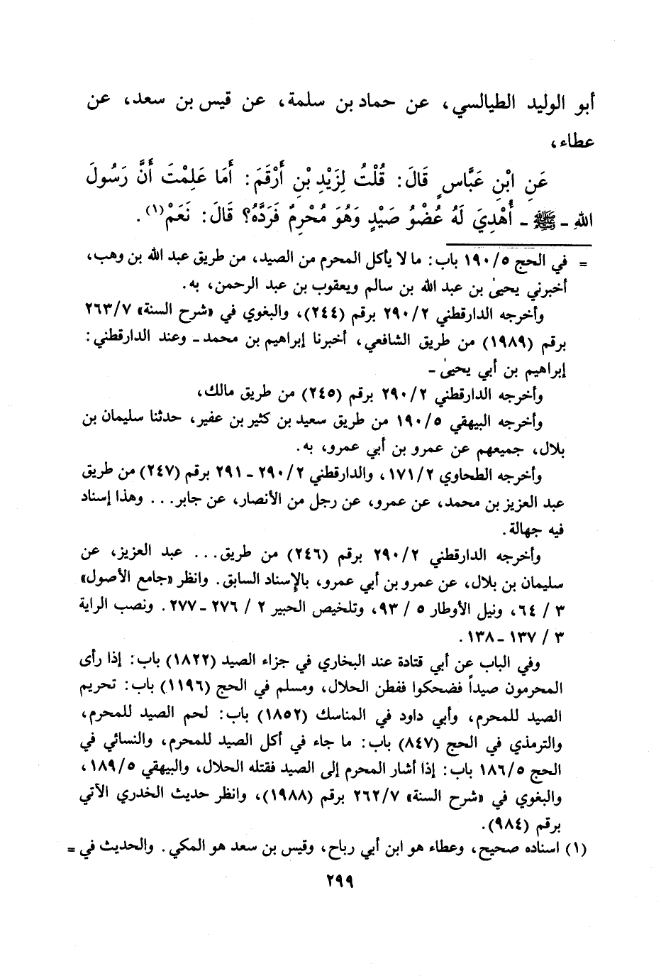 عَنِ ابْنِ عَبَّاس قَالَ: قُلْتُ لِزَيْدِ بْنِ أرْقَمَ: أمَا عَلِمْتَ أنَّ رَسُولَ اللهِ -صلى الله عليه وسلم- أُهْدِيَ لَهُ عُضْوُ صَيْدٍ وَهُوَ مُحْرِمٌ فَرَدَّهُ؟ قَالَ: نَعَمْ (¬1).