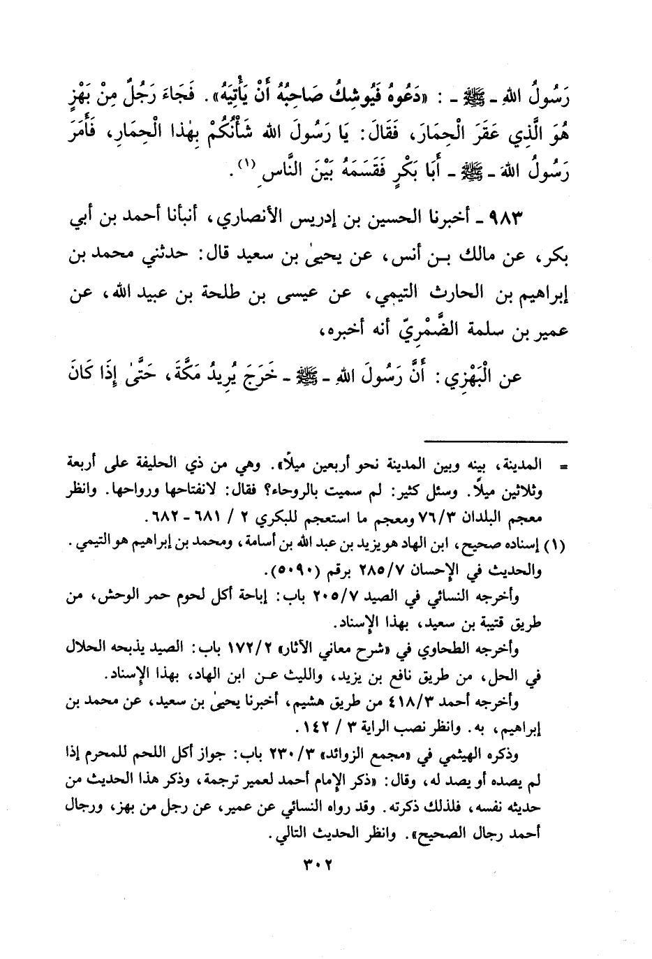 رَسُولُ اللهِ -صلى الله عليه وسلم-: "دَعُوهُ فَيُوشِكُ صَاحِبُهُ أنْ يَأْتِيَهُ". فَجَاءَ رَجُل مِنْ بَهْزٍ هُوَ الَّذِي عَقَرَ الْحِمَارَ، فَقَالَ: يَا رَسُولَ الله شَاْنُكُمْ بِهذا الْحِمَارِ، فَأمَرَ رَسُولُ اللهَ -صلى الله عليه وسلم- أبَا بَكْرٍ فَقَسَمَهُ بَيْنَ النَّاسِ (¬1).