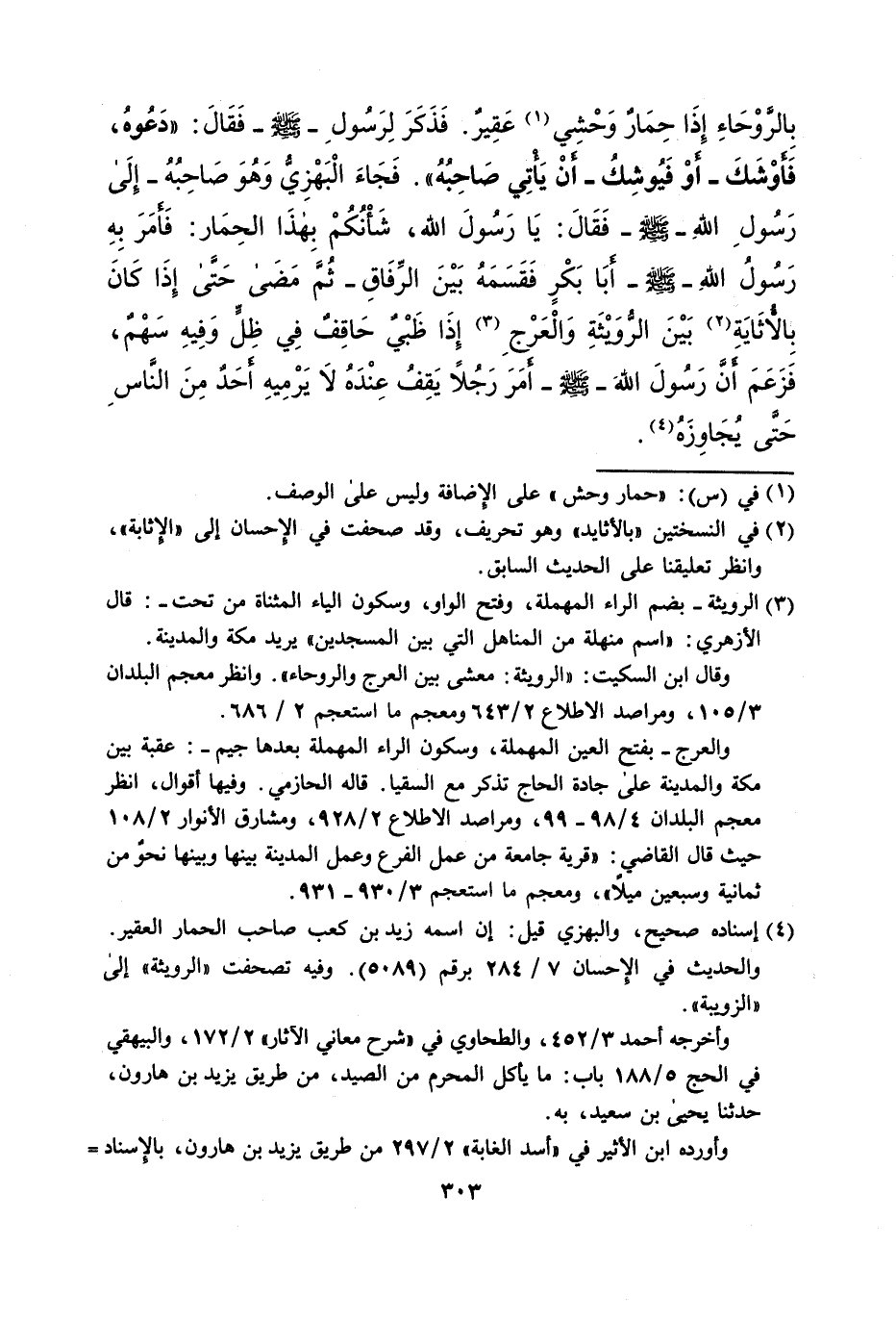 بِالرَّوْحَاءِ إِذَا حِمَارٌ وَحْشي (¬1) عَقِيرٌ. فَذَكَرَ لِرَسُولِ -صلى الله عليه وسلم- فَقَالَ: "دَعُوهُ، فَأوْشَكَ- أوْ فَيُوشِكُ- أَنْ يأْتى صَاحِبُهُ". فَجَاءَ الْبَهْزِيُّ وَهُوَ صَاحِبُهُ- إلَى رَسُولِ اللهِ -صلى الله عليه وسلم- فَقَالَ: يَا رسول الله، شَاْنُكُمْ بِهذَا الحِمَار: فَأمَرَ بِهِ رَسُولُ اللهِ -صلى الله عليه وسلم- أَبَا بَكْرٍ فَقَسَمَهُ بَيْنَ الرِّفَاقِ- ثُمَ مَضَى حَتَّى إِذَا كَانَ بِالأُثَايَةِ (¬2) بَيْنَ الرُّويثَةِ وَالْعَرْجِ (¬3) إذَا ظَبْي حَاقِفٌ فِي ظِلٍّ وَفِيهِ سَهْمٌ، فزعم أنَّ رَسُول اللهَ -صلى الله عليه وسلم- أمَرَ رَجُلاً يَقِفُ عِنْدَهُ لاَ يَرْمِيهِ أحَدٌ مِنَ النَّاسِ حَتَّى يُجَاوِزَهُ (¬4).