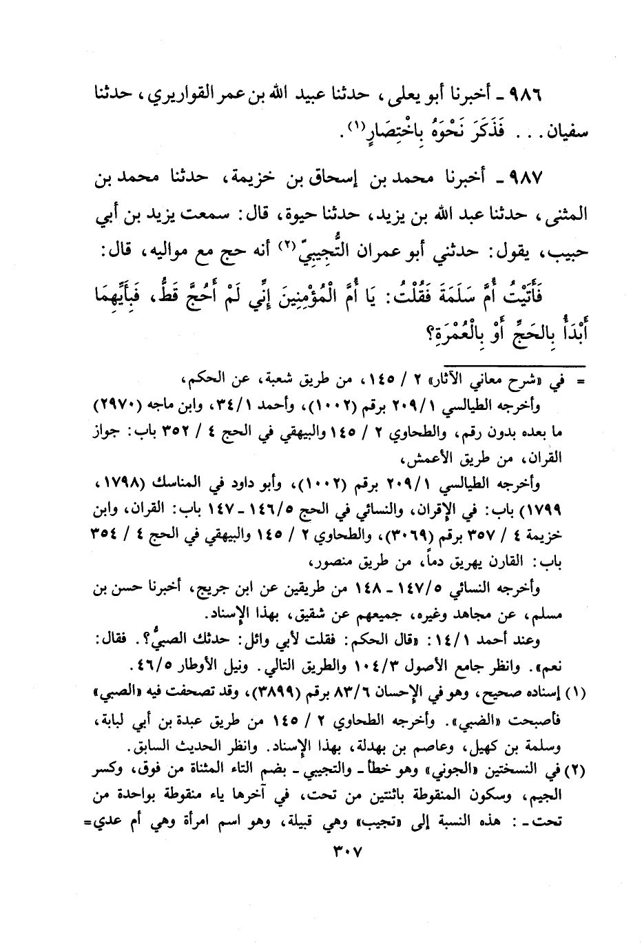 وأخرجه الطيالسي1/ 209 برقم (1002)، وأبو داود في المناسك (1798، 1799) باب: في الإقران، والنسائي في الحج 5/ 146 - 147 باب: القرآن، وابن خزيمة 4/ 357 برقم (3069)، والطحاوي 2/ 145 والبيهقي في الحج 4/ 354 باب: القارن يهريق دماً، من طريق منصور،