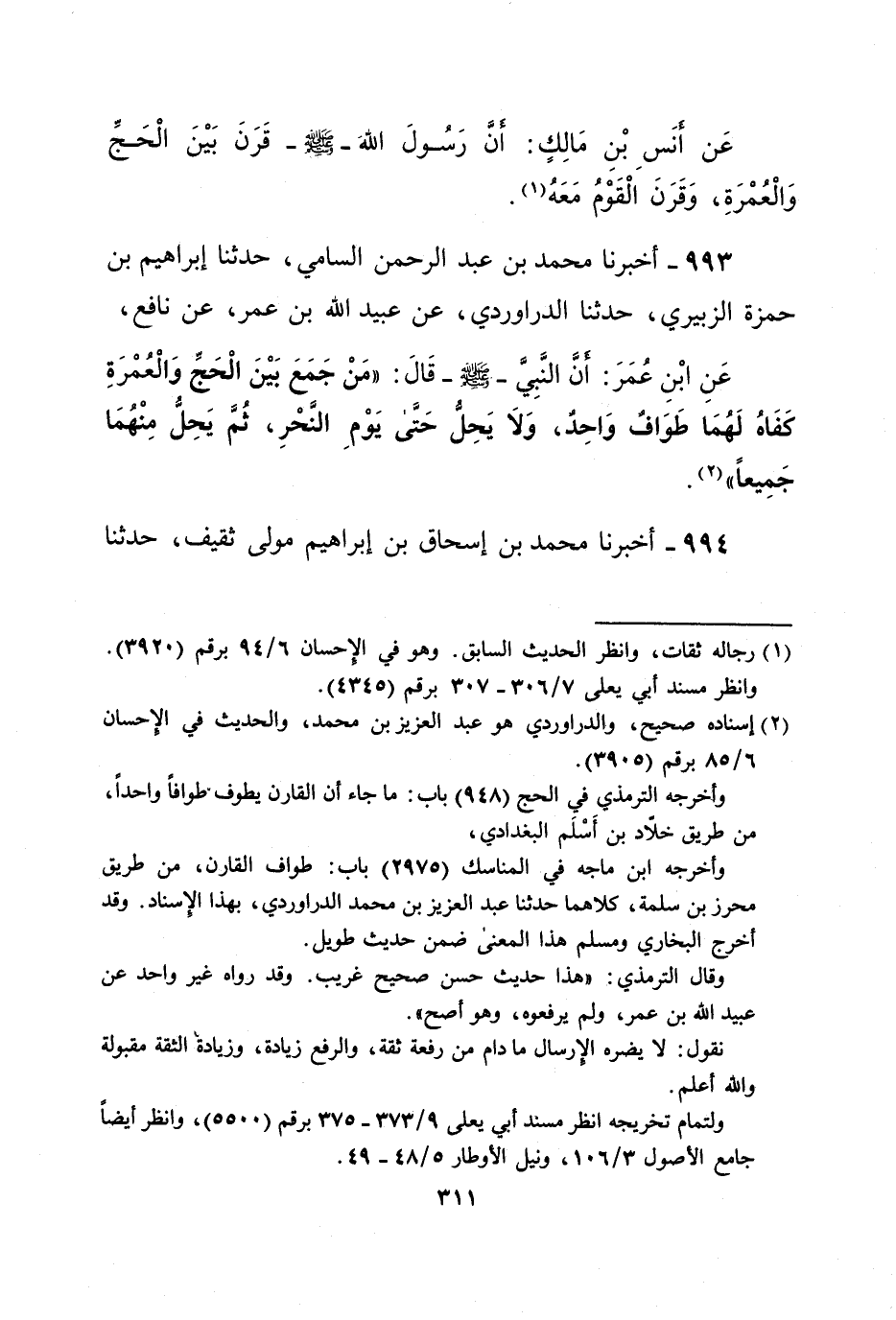993 - أخبرنا محمد بن عبد الرحمن السامي، حدثنا إبراهيم بن حمزة الزبيري، حدثنا الدراوردي، عن عبيد الله بن عمر، عن نافع،