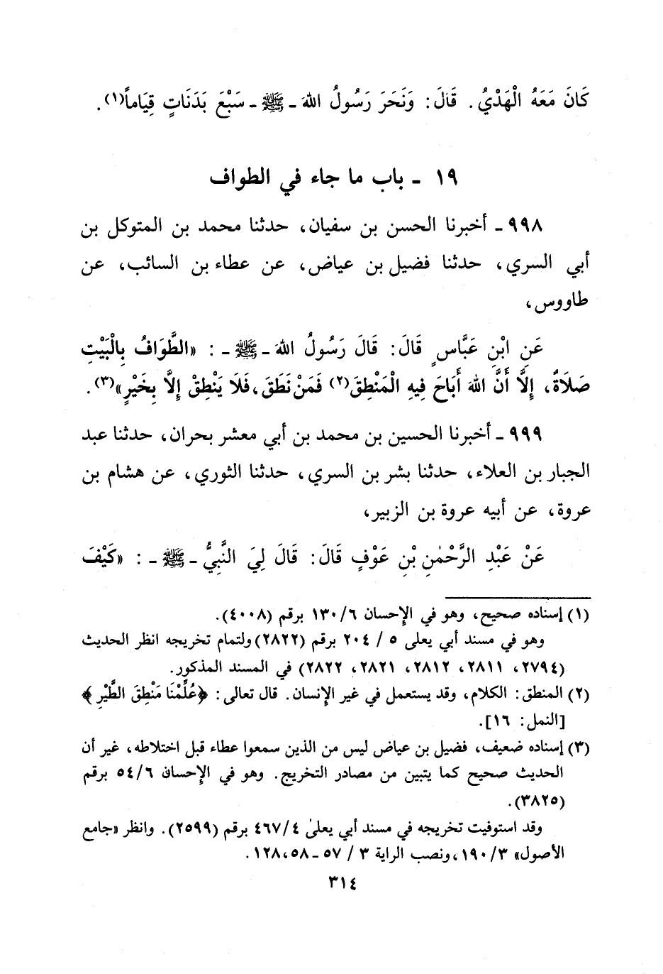 عَن ابْنِ عَبَّاسٍ قَالَ: قَالَ رَسُولُ اللهَ-صلى الله عليه وسلم-: "الطَّوَافُ بِالْبَيْتِ صَلاَةٌ، إِلاَ أنَّ اللهَ أبَاحَ فِيهِ الْمَنْطِقَ (¬2) فَمَنْ نَطَقَ، فَلاَ يَنْطِقْ إِلاَ بِخَيْرٍ" (¬3).