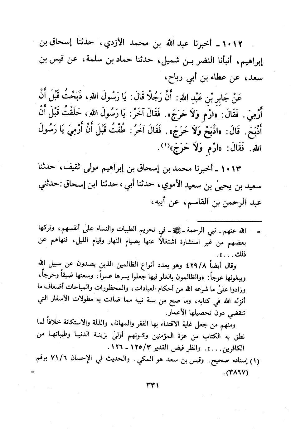 1012 - أخبرنا عبد الله بن محمد الأزدي، حدثنا إسحاق بن إبراهيم، أنبأنا النضر بن شميل، حدثنا حماد بن سلمة، عن قيس بن سعد، عن عطاء بن أبي رباح،
