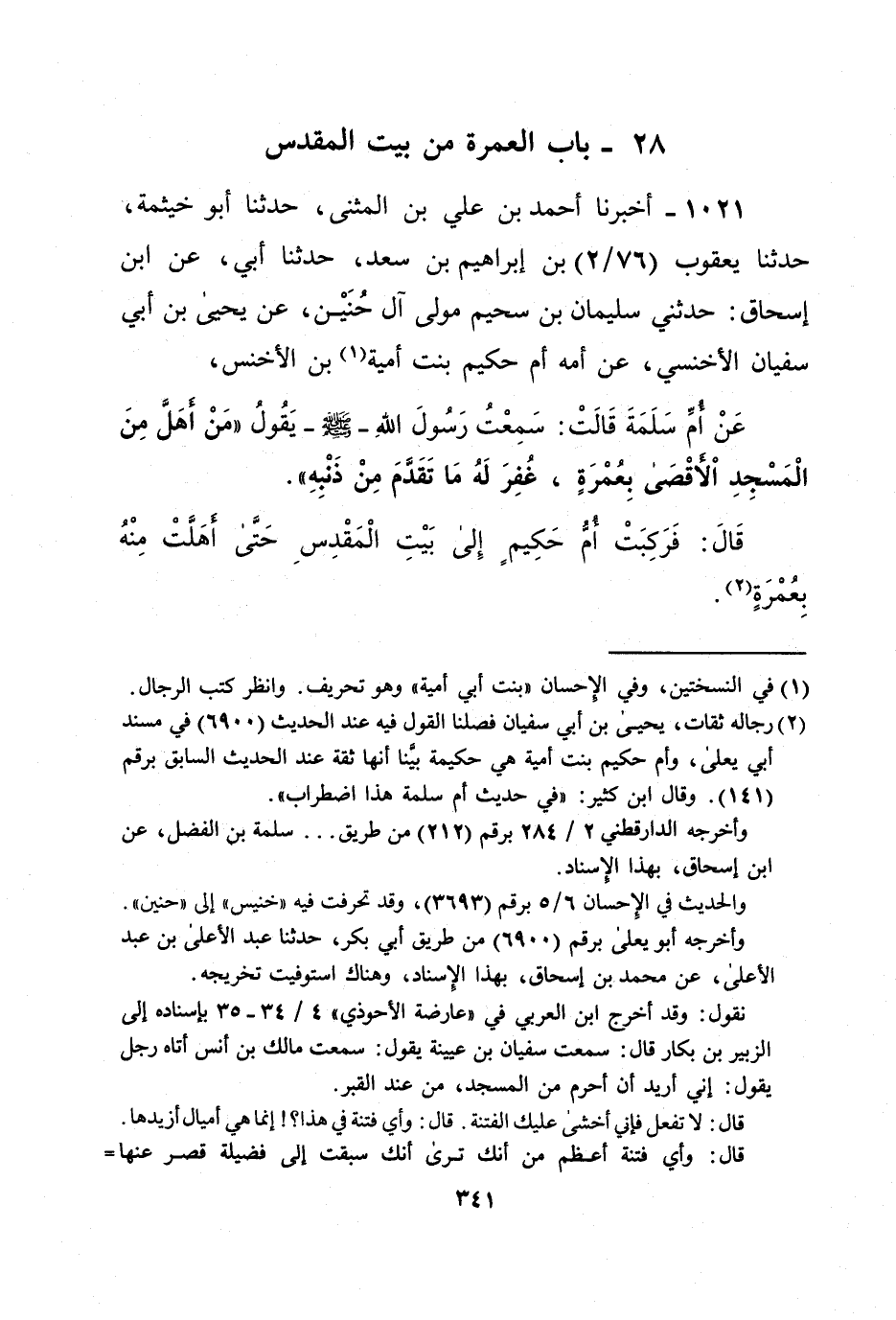 عَنْ أُمِّ سَلَمَةَ قَالَتْ: سَمِعْتُ رَسُولَ الله- صلى الله عليه وسلم- يَقُولُ "مَنْ أهَلَّ مِنَ الْمَسْجِدِ اْلأقْصَى بِعُمْرَةٍ، غُفِرَ لَهُ مَا تَقَدَّمَ مِنْ ذَنْبِهِ".