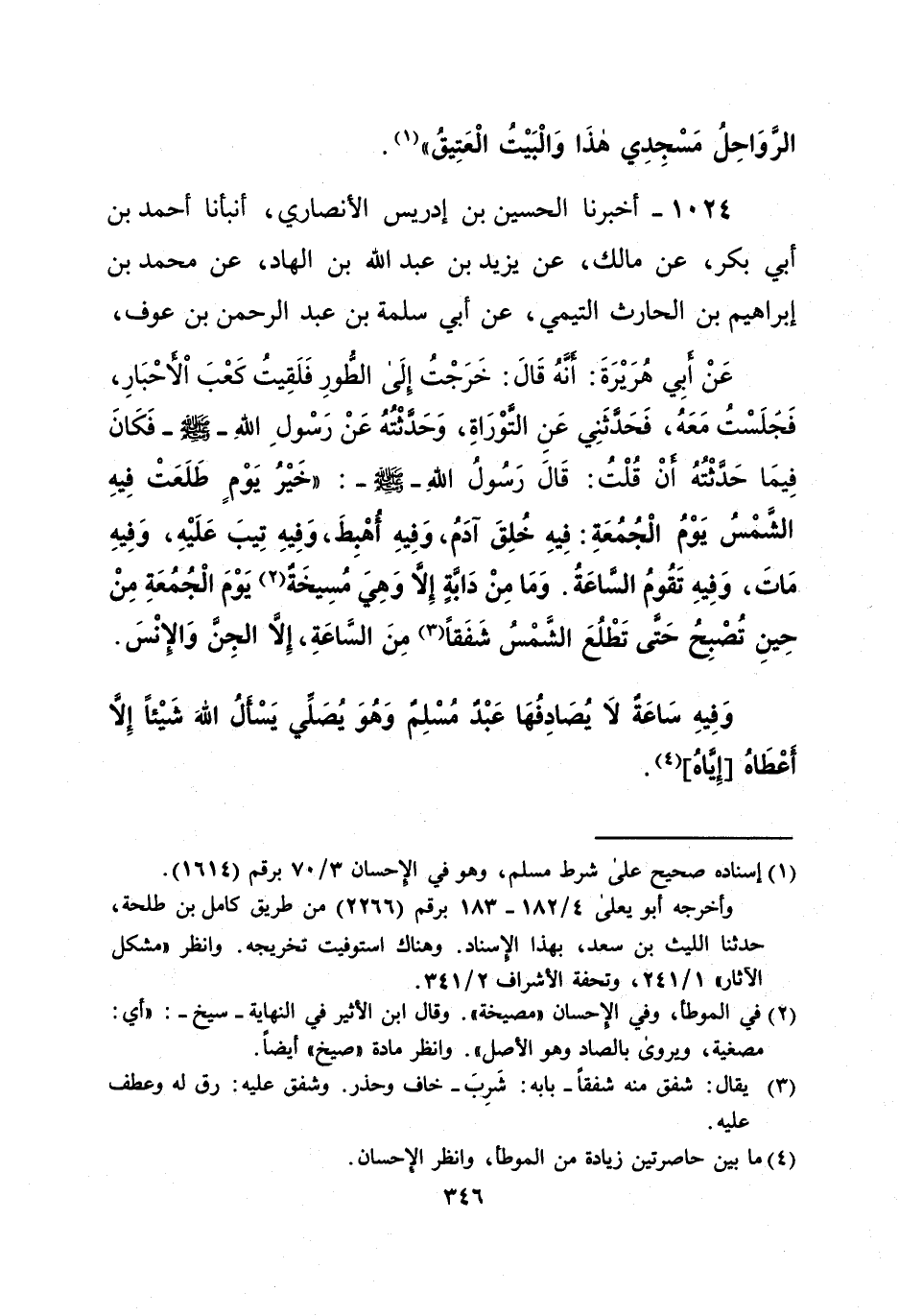 عَنْ أبِي هُرَيْرَةَ: أنَّهُ قَالَ: خَرَجْتُ إلَى الطُورِ فَلَقِيتُ كَعْبَ اْلأحْبَارِ، فَجُلَسْتُ مَعَهُ، فَحَدَّثَنِي عَنِ التَّوْرَاةِ، وَحَدَّثْتُهُ عَنْ رَسْولِ اللهِ -صلى الله عليه وسلم- فَكَانَ فِيمَا حَدَّثْتُهُ أنْ قُلْتُ: قَالَ رَسُولُ الله -صلى الله عليه وسلم-: " خَيْرُ يَوْمٍ طَلَعَتْ فِيهِ الشَّمْسُ يَوْمُ الْجُمُعَةِ: فِيهِ خُلِقَ آدَمُ، وَفِيهِ أُهْبِطَ، وَفِيهِ تِيبَ عَلَيْهِ، وَفِيهِ مَاتَ، وَفِيهِ تَقُومُ السَّاعَةُ. وَمَا مِنْ دَابَّةٍ إِلاَّ وَهِيَ مُسِيخَةٌ (¬2) يَوْمَ الْجُمُعَةِ مِنْ حِينِ تُصْبِحُ حَتَّى تَطْلُعَ الشَّمْسُ شَفَقاً (¬3) مِنَ السَّاعَةِ، إِلاَّ الجِنَّ وَالإنْسَ. وَفِيهِ سَاعَة لا يُصَادِفُهَا عَبْدٌ مُسْلِمٌ وَهُوَ يُصَلِّي يَسْأَلُ الله شيْئاً إِلاَّ أعْطَاهُ [إِيَّاهُ] (¬4).