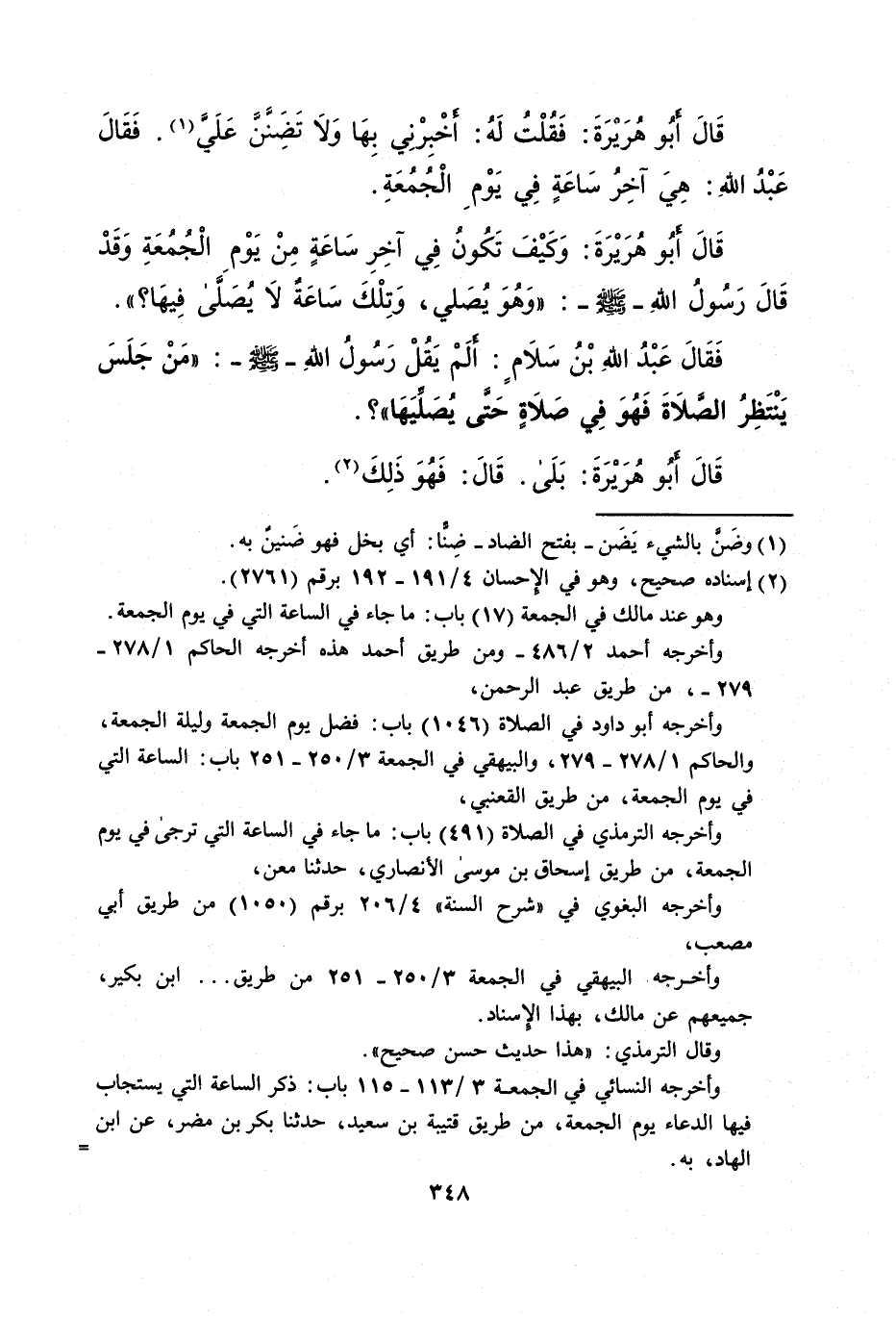 عَبْدُ اللهِ: هِيَ آخِرُ سَاعَةٍ فِي يَوْمِ الْجُمُعَةِ. قَالَ أبو هُرَيْرَةَ: وَكَيْفَ تَكُونُ فِي آخِرِ سَاعَةٍ مِنْ يَوْم الجمعة وَقَدْ قَالَ رَسُولُ اللهِ -صلى الله عليه وسلم-: "وَهُوَ يُصَلي، وَتِلْكَ سَاعَة لا يصَلَّى فِيهَا؟ ". فَقَالَ عَبْدُ اللهِ بْنُ سَلامٍ: ألَمْ يَقُلْ رَسُولُ الله -صلى الله عليه وسلم-: "مَنْ جَلَسَ يَنْتَظِرُ الصَّلاَةَ فَهُوَ فِي صَلاَةٍ حَتَّى يُصَليَهَا"؟. قَالَ أبو هُرَيْرَةَ: بَلَى. قَالَ: فَهُوَ ذَلِكَ (¬2).
