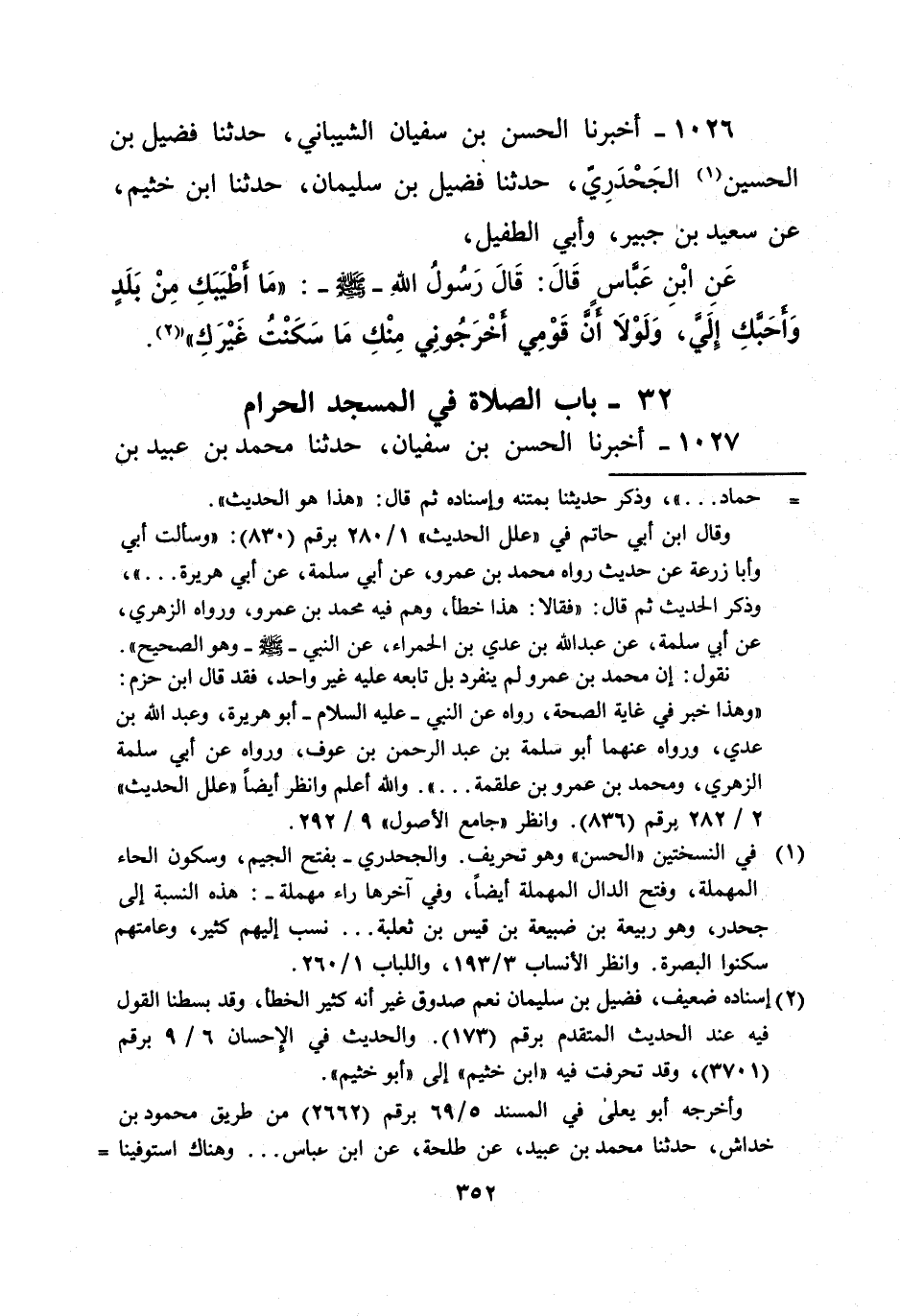 1026 - أخبرنا الحسن بن سفيان الشيباني، حدثنا فضيل بن الحسين (¬1) الجَحْدَرِيّ، حدثنا فضيل بن سليمان، حدثنا ابن خثيم، عن سعيد بن جبير، وأبي الطفيل، عَنِ ابْنِ عَبَّاس قَالَ: قَالَ رسول الله -صلى الله عليه وسلم-: "مَا أطْيَبَكِ مِنْ بَلَدٍ وَأحَبَّكِ إليَّ، وَلَوْلا أن قَوْمِي أخْرَجونِي مِنْكِ مَا سَكَنْت غيْرَكِ" (¬2).